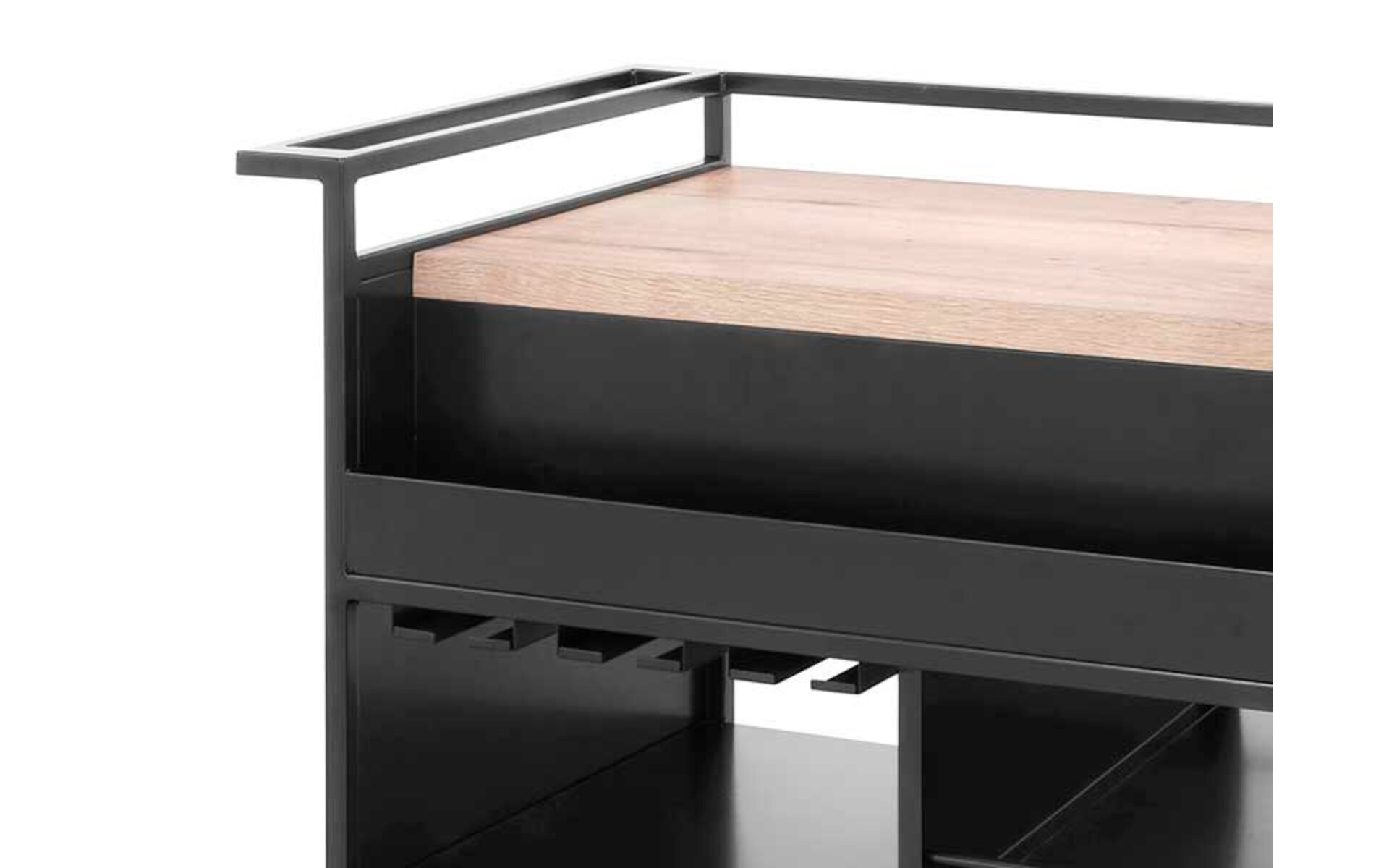 Het ontwerp omvat drie rails voor het ophangen van glazen, specifieke planken voor mixers en een speciale ruimte voor maximaal 20 drankglazen. Bovendien heeft hij zijplanken voor het opbergen van flessen, allemaal op een satijnzwarte verfstructuur die duurzaamheid en een onderscheidende uitstraling garandeert.