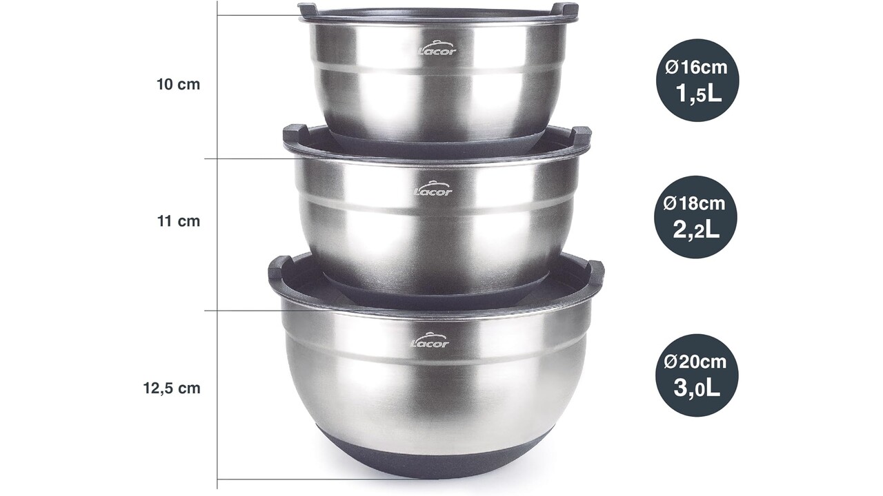Set van 3 kommen gemaakt van de hoogste kwaliteit roestvrij staal Satijnen binnen- en buitenafwerking Ideaal voor mixen, kloppen, pasta bereiden en salades of sauzen serveren