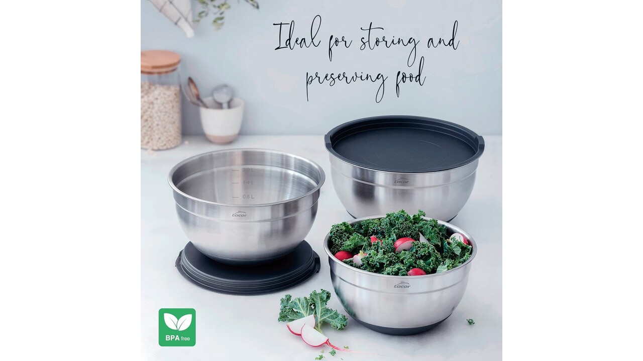Samengesteld uit 3 kommen die perfect op elkaar gestapeld kunnen worden Inclusief 3 luchtdichte polypropyleen deksels, BPA-vrij