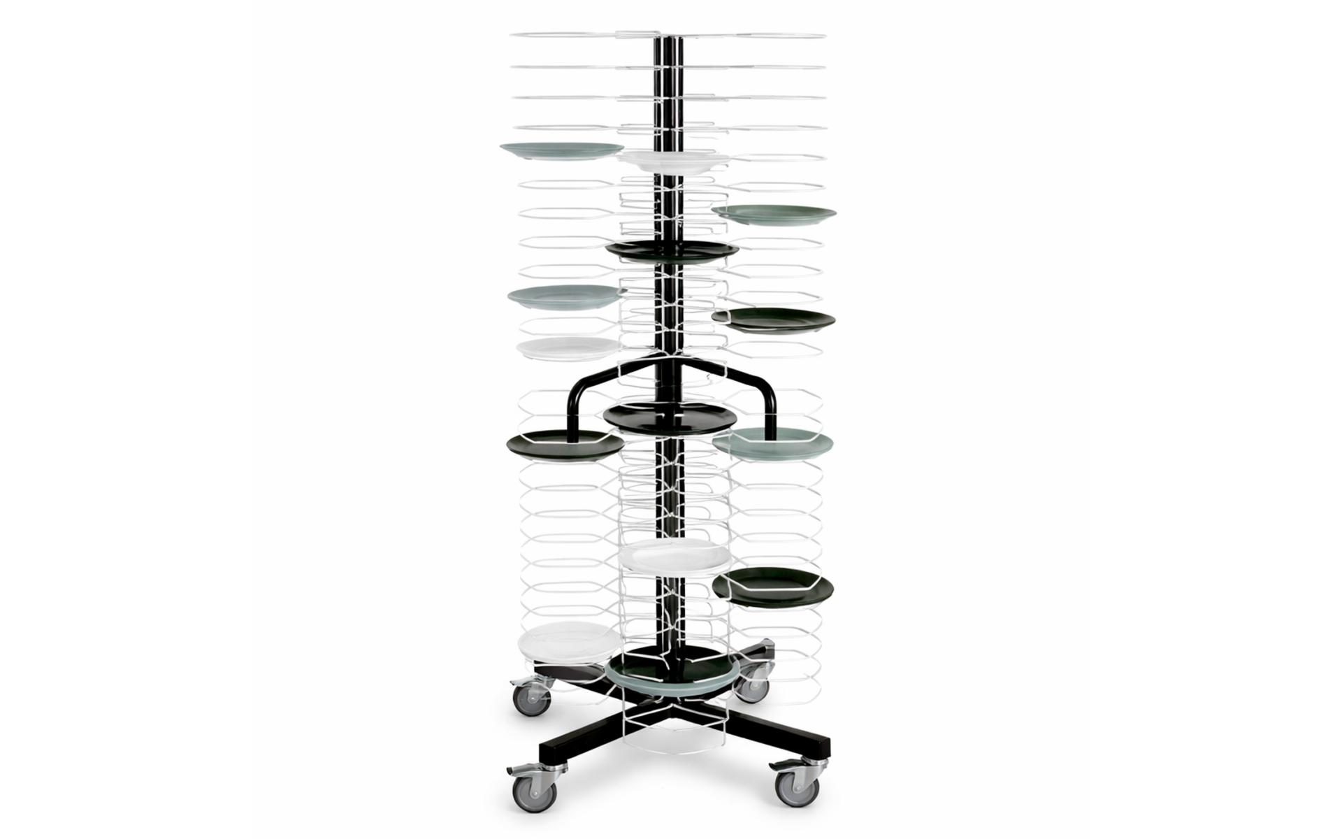 • Constructie van staal met zwarte epoxy poedercoating • Stalen bordenhouders met witte rilsan kunststof coating • Duwbeugels • Zwenkwielen, ø 12,5 cm, waarvan 2 met rem