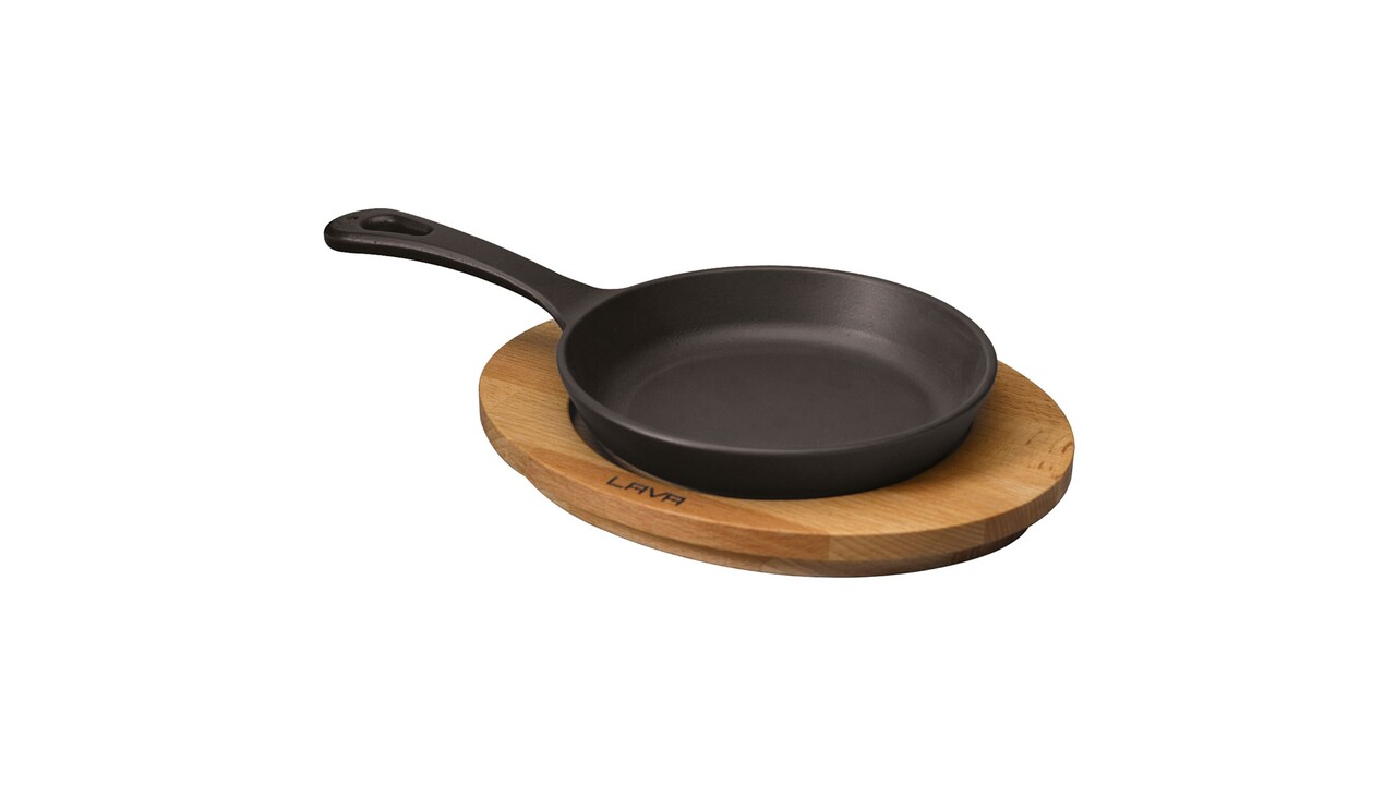 Braad & serveerpan Ø 16 cm zwart gietijzer geleverd met houten onderzetter