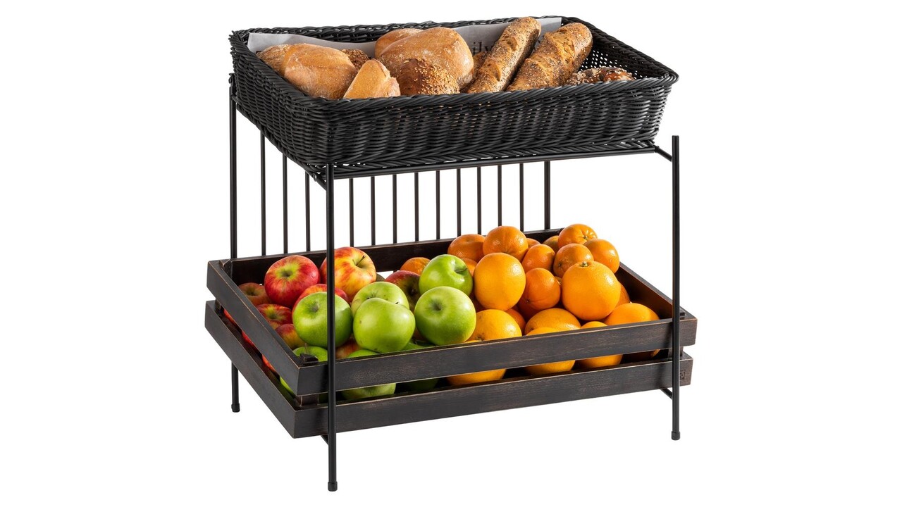 Deze set omvat één zwart metalen frame, met één zwart houten krat GN 1/1 hoogte 10,5 cm en één mand GN 1/1 hoogte 10 cm, gemaakt van zwart gevlochten polypropyleen PP draad. Verstevigde mand met rvs draad
