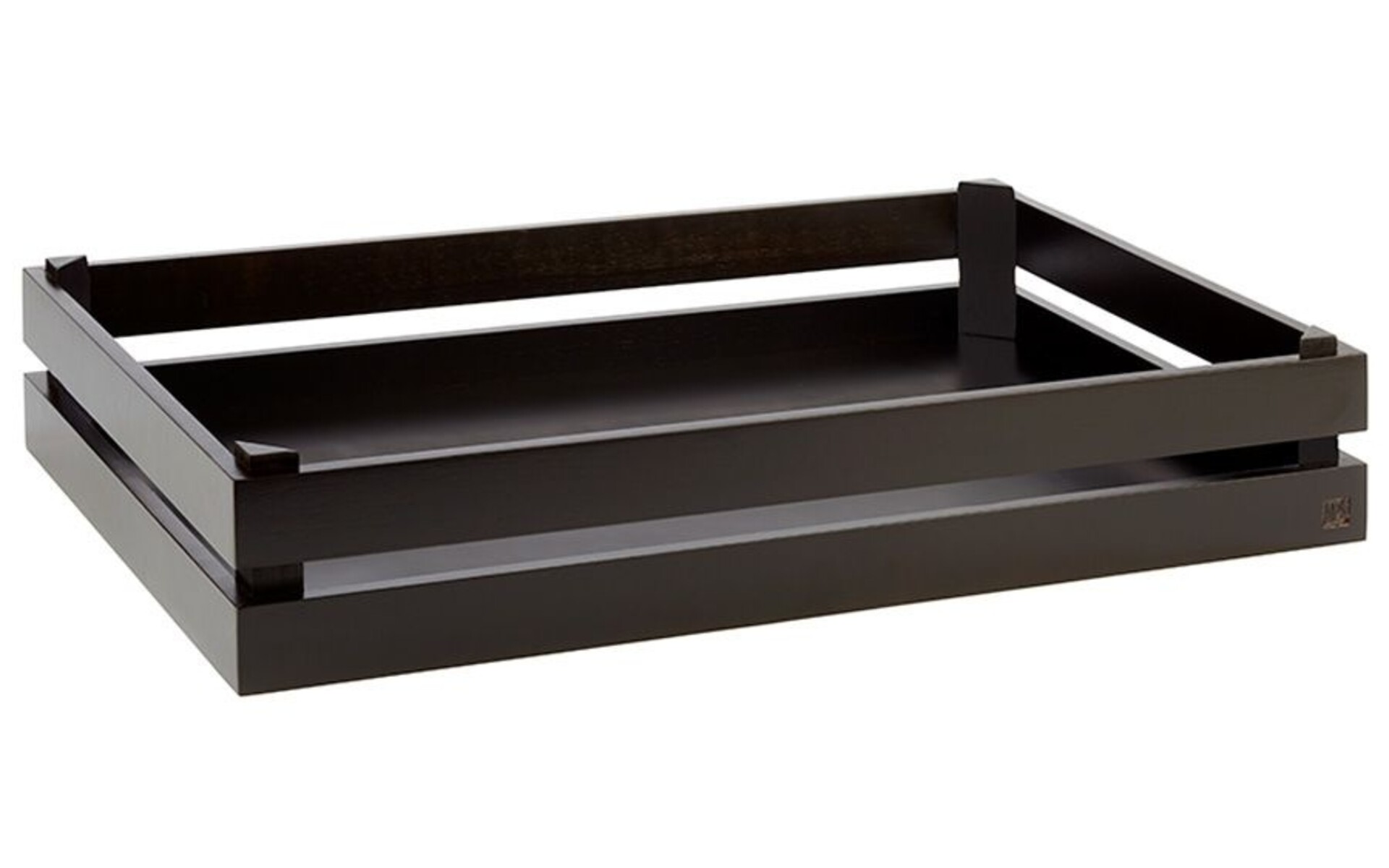 Deze set omvat één zwart metalen frame, één zwart houten krat GN 1/1 hoogte 10,5 cm deze is voorzien van een kunststof PS inzet om koeling te voorzien door middel van ijsblokjes , en twee zwart houten kratten GN 1/2 hoogte 10,5 cm.