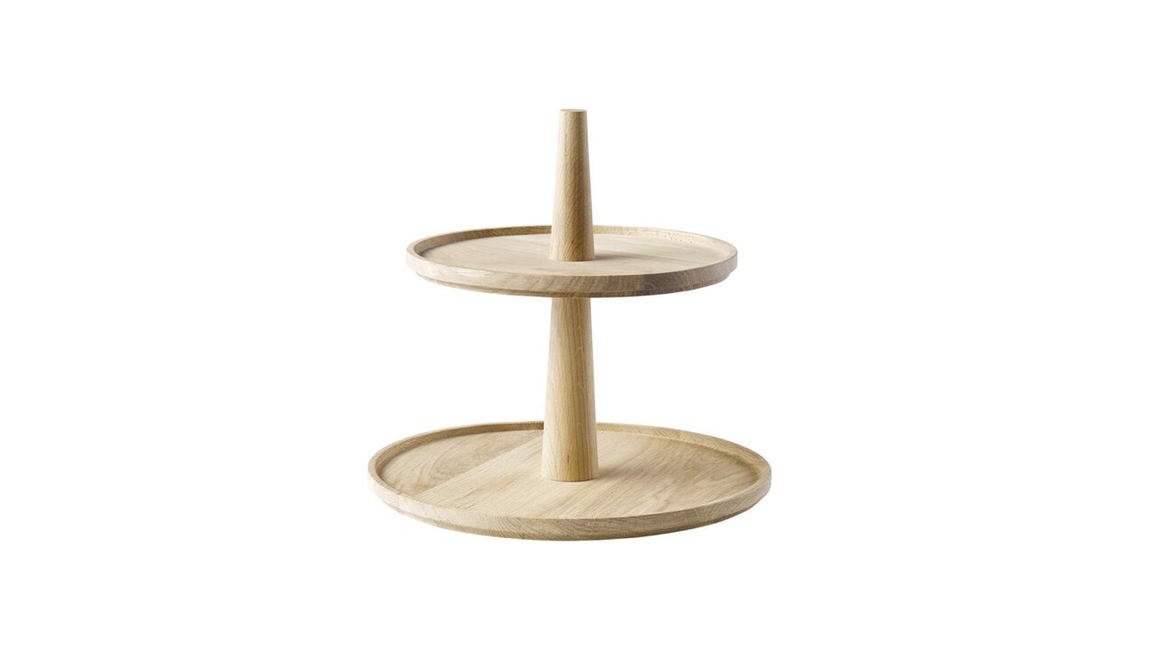 Gemaakt van natuurlijk eikenhout (geolied). Onderste niveau: diam. 30 cm. Bovenste niveau : diam. 25 cm. Hoogte: 28 cm.