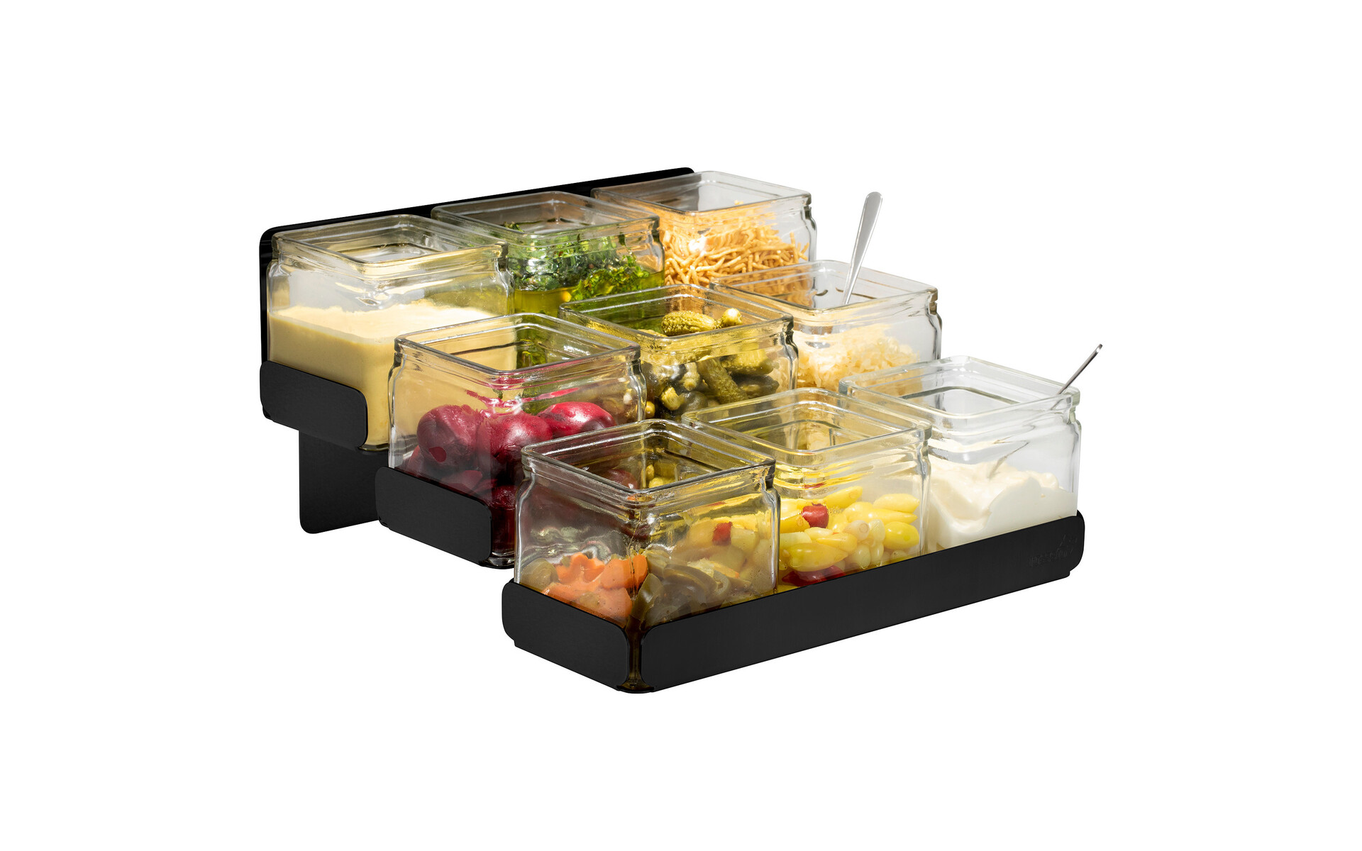 Dit condiment "station" kan zowel op een buffet als achter de bar gebruikt worden.