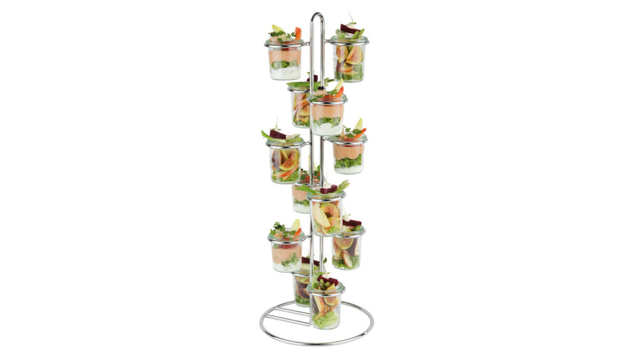 Deze buffet standaard van verchroomd metaal is geschikt voor de Weck potjes met artikelnummer 82310, 82312 en 82314 deze zijn apart te bestellen.