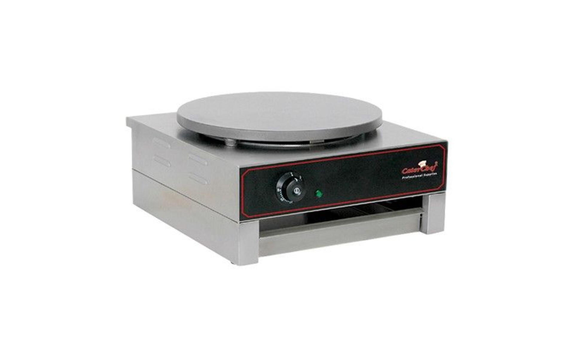 Roestvrijstaal, platen Ø 40 cm uit gietijzer met teflon coating, met traploze instelbare thermostaat 0° ~ 300°C, controlelampje, lade/warmhoudplaat en beslagspreider