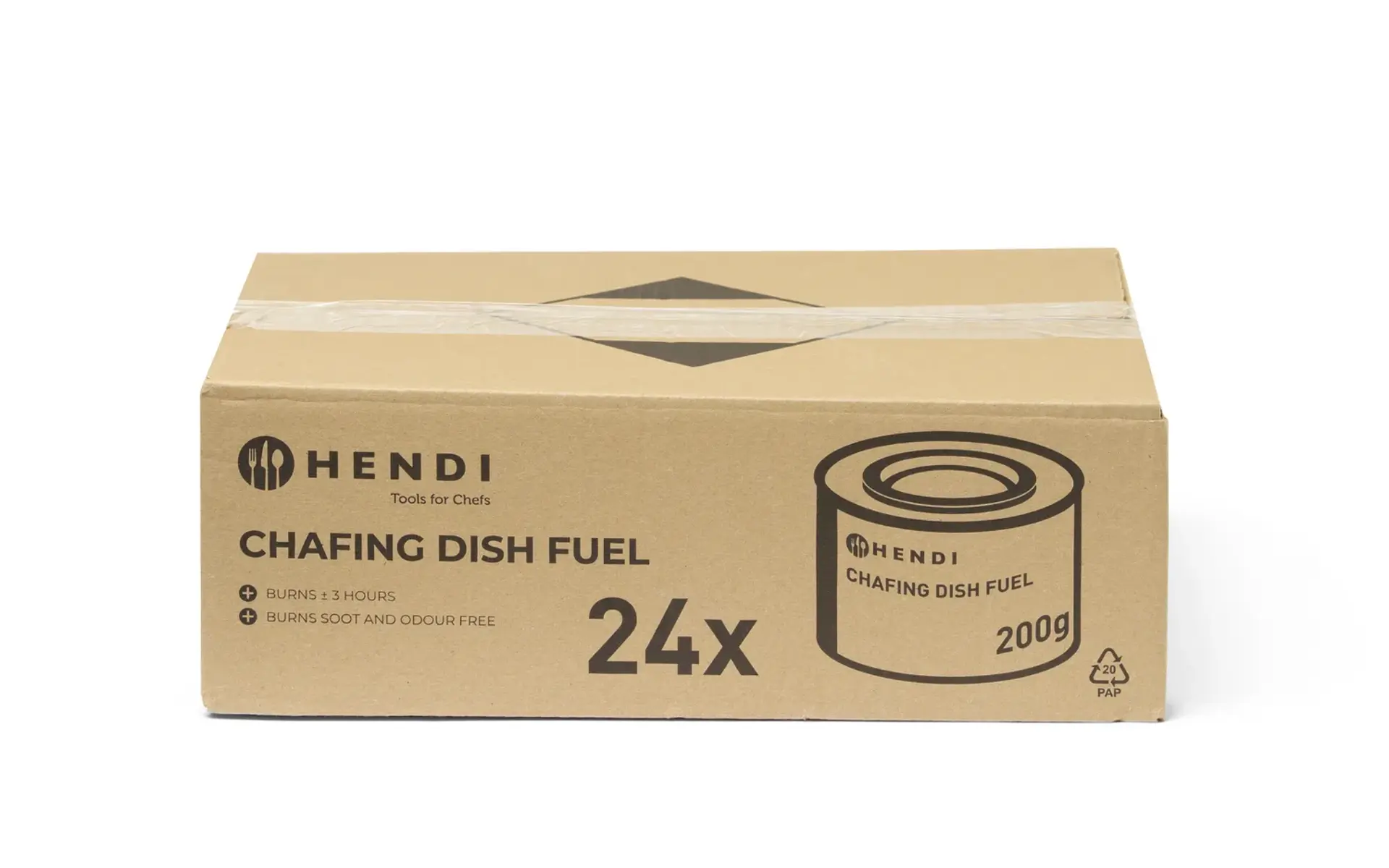 200 g chafing dish brandpasta, brandduur ±3 uur. Gemaakt van ethanol, roet- en geurloos, kunstmatig bitter. Gebruik altijd een brandpastahouder. Vlam is bijna onzichtbaar. Doof door deksel te sluiten. Alleen bijvullen na afkoelen.