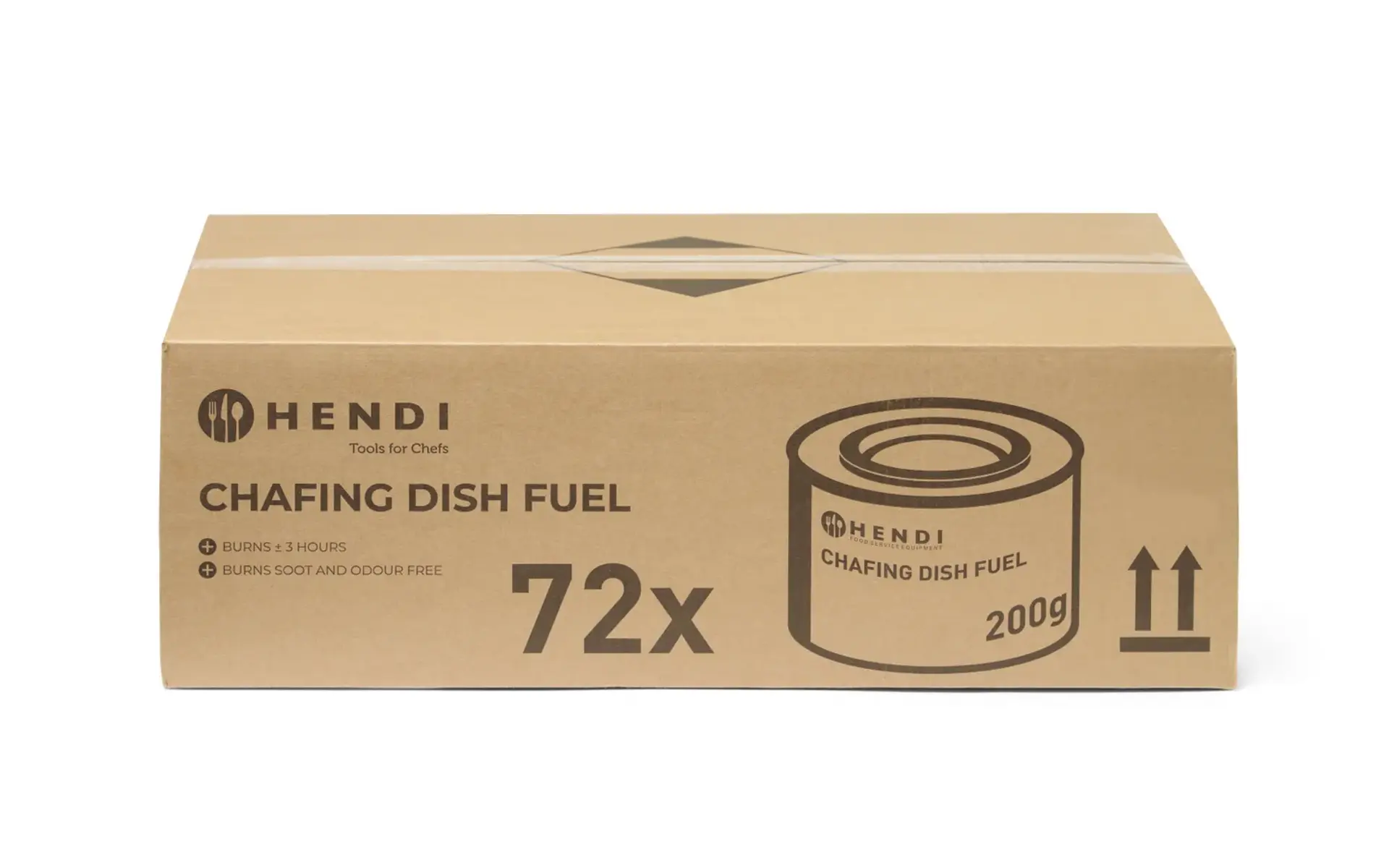 200 g chafing dish brandpasta, brandduur ±3 uur. Gemaakt van ethanol, roet- en geurloos, kunstmatig bitter. Gebruik altijd een brandpastahouder. Vlam is bijna onzichtbaar. Doof door deksel te sluiten. Alleen bijvullen na afkoelen.