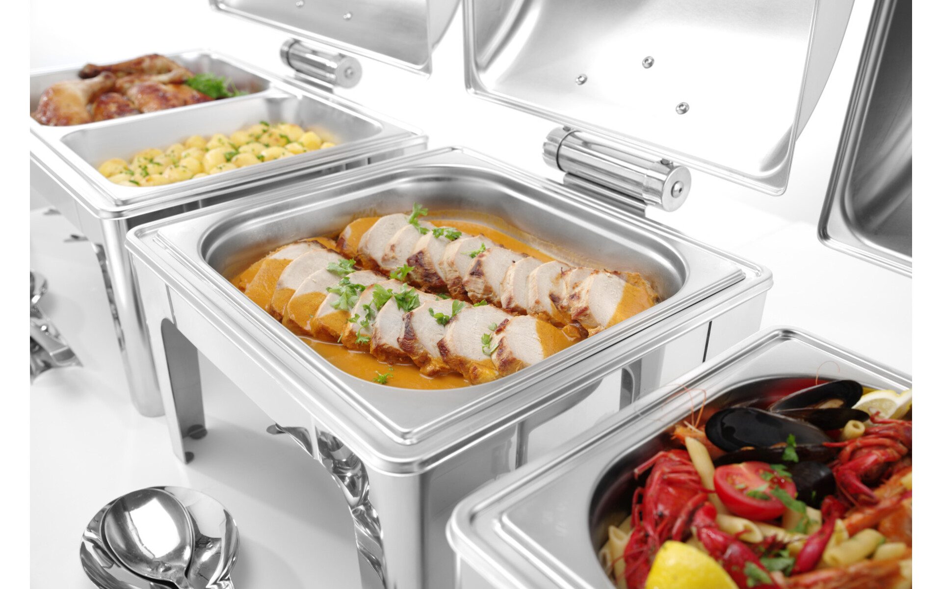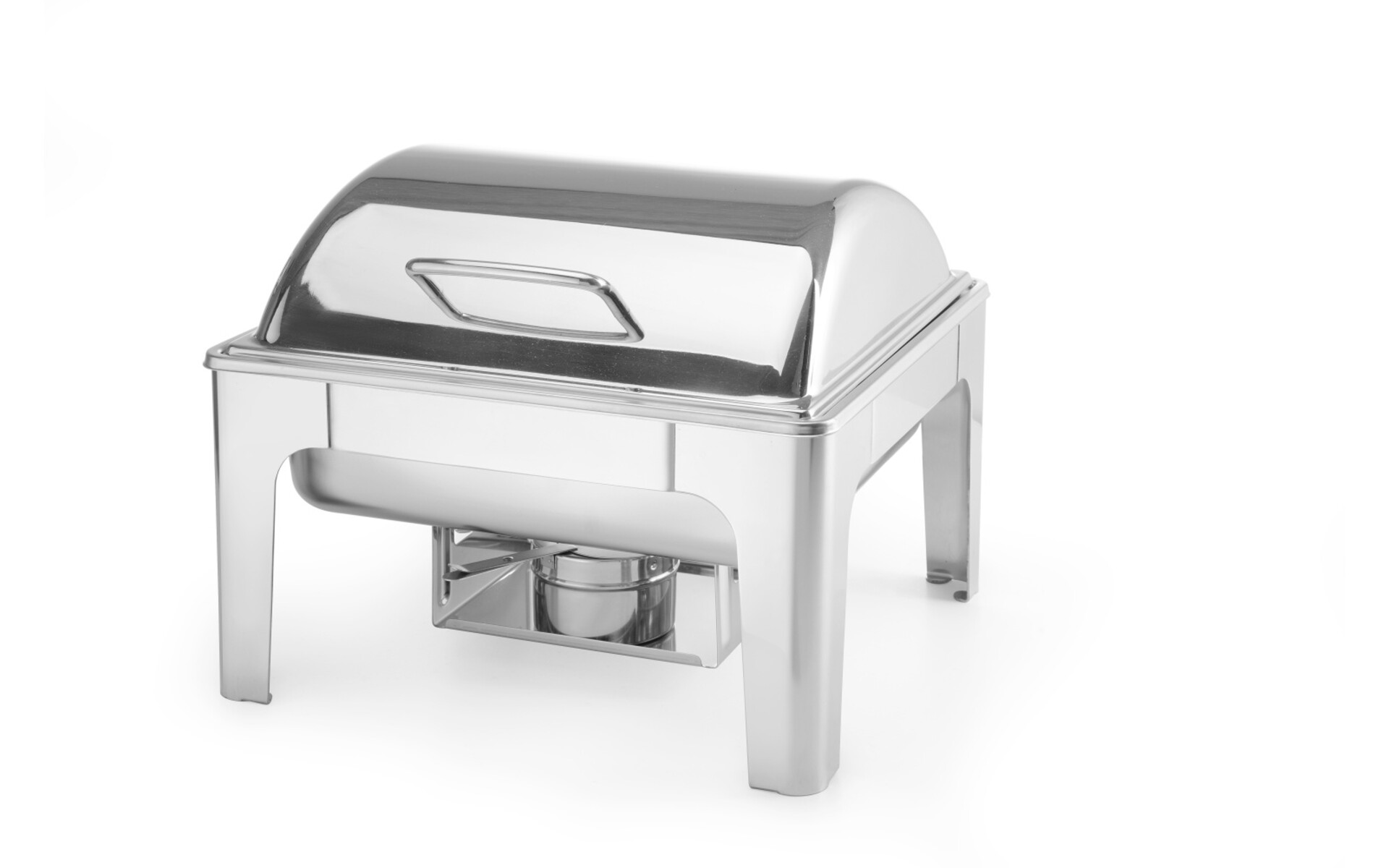 Ideaal voor buffetten en catering. Door het gebruik van hoogwaardig materiaal en fraaie afwerking geven deze chafing dishes elk gepresenteerd gerecht een zekere allure mee. De chafing dishes en accessoires zijn geheel gemaakt van duurzaam roestvast staal. De deksel is voorzien van een frictierem en kan daardoor in elke gewenste positie geplaatst worden. De deksel kan worden verwijderd om het schoonmaken te vergemakkelijken. Wordt geleverd met verwijderbare waterpan, GN 2/3 65 mm diepe voedselpan en 2 chafing dish brandstofhouders.