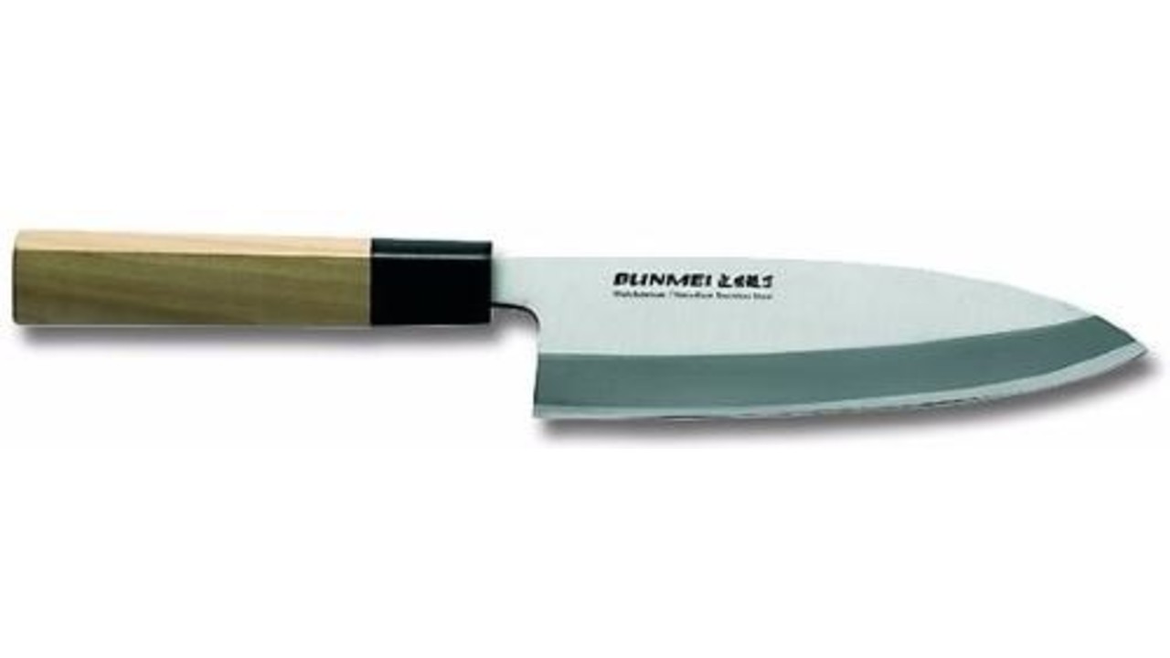Resistent en breed asymmetrisch mes van 225 mm van molybdeen/vanadium roestvrij staal. Houten handvat met zwarte bolster. Traditioneel Japans mes, ideaal voor het snijden van botten en het snijden van vis. Zéér scherp. Niet vaatwasmachine bestendig.