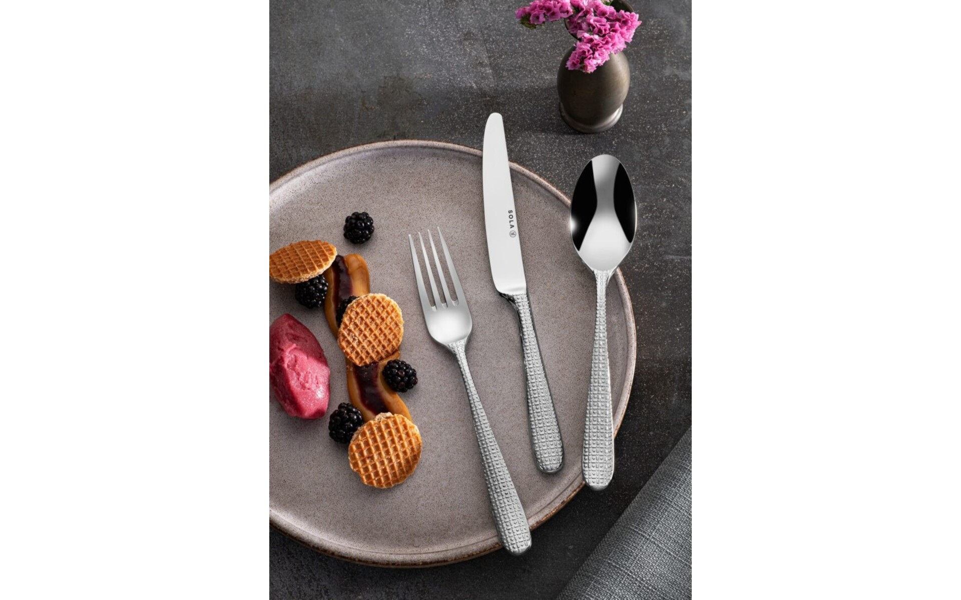Amsterdam bestek met zowel op de voor- als achterkant een originele reliëf decoratie. Dit premium model is vervaardigd uit het beste 18/10 chroom/nikkel staal. Een ware eye-catcher op uw tafel.