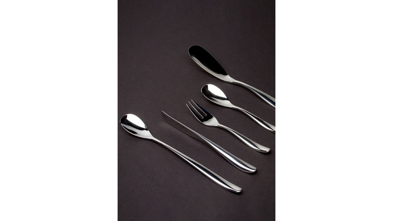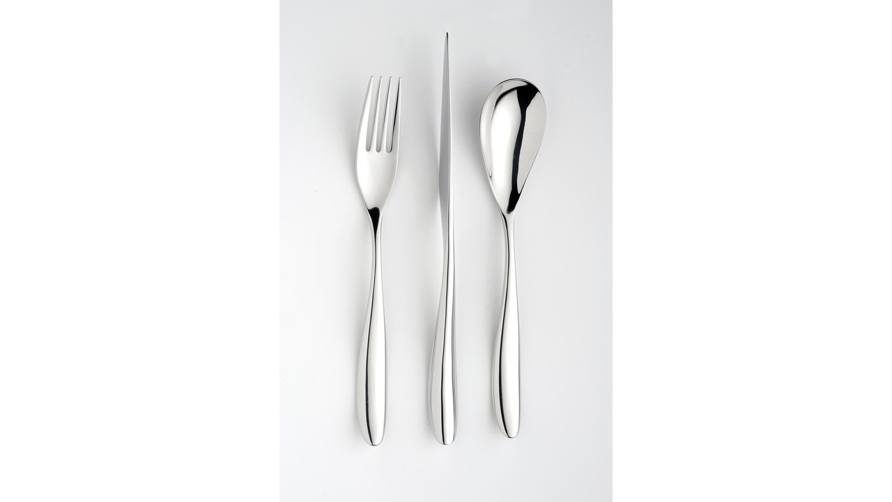 De Franse designers Pierre Duthoit en Adrien Ciejak lieten zich voor dit ontwerp inspireren door een bloemblad. Zijn lichte en vloeiende krommingen maken Pétale werkelijk uniek. Het mes rust op de snijkant en vormt zo een perfect geheel met het vork en de lepel.