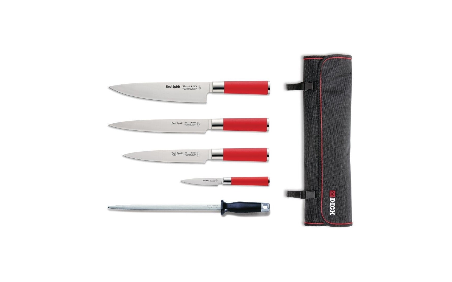 Een 5-delige set messen naar Aziatisch voorbeeld geproduceerd in Duitsland met hoog nivo van precisie, kwaliteit en betrouwbaarheid. Ronde vorm, Aziatische stijl, rode heften voor comfortabel gebruik. RVS.