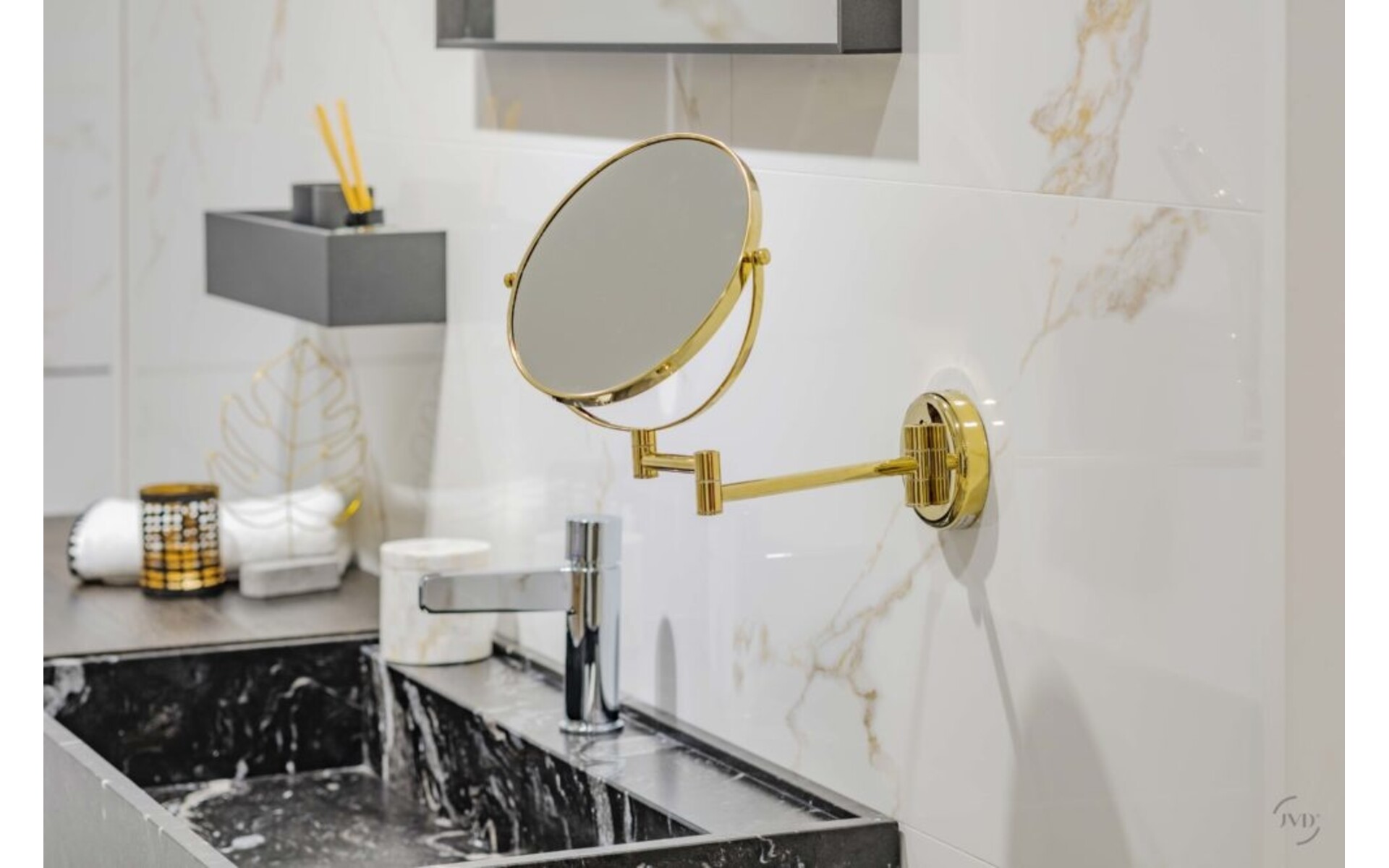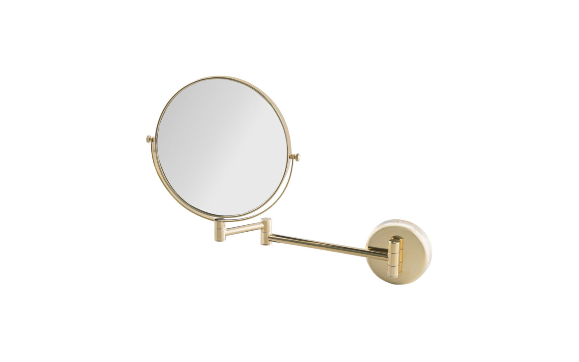 Dubbelzijdig : normaal en visie x 3 Buisvormige arm van verchroomd messing. Formaat : rond. Kleur: Goudkleurig