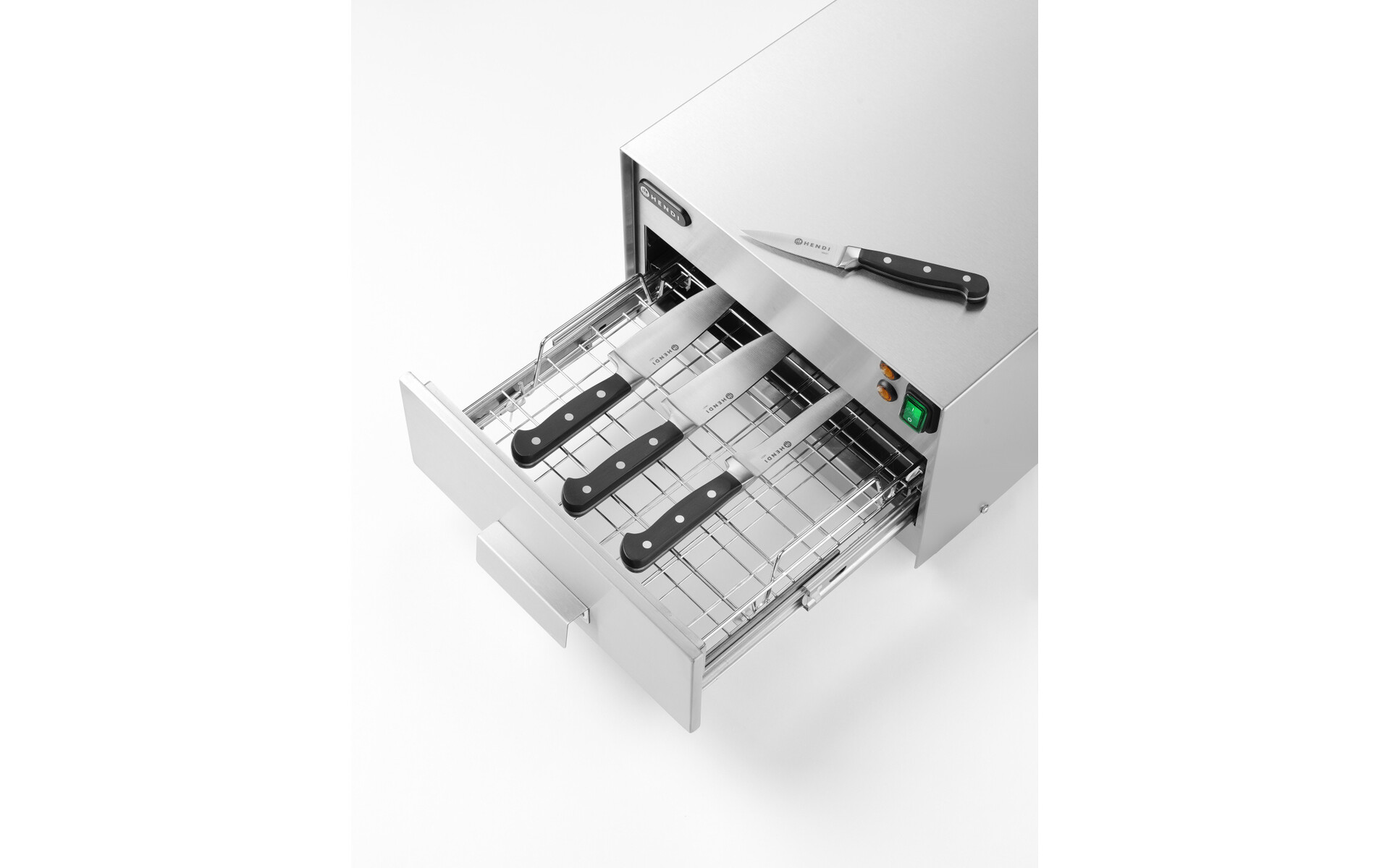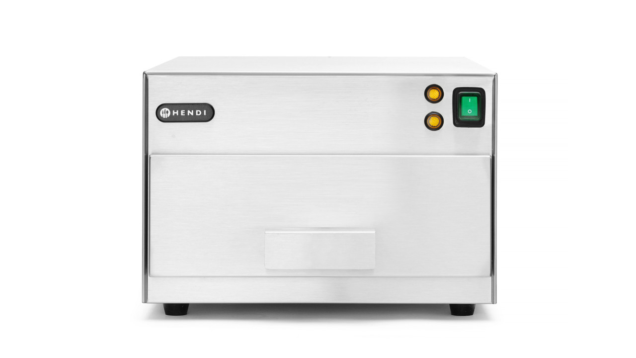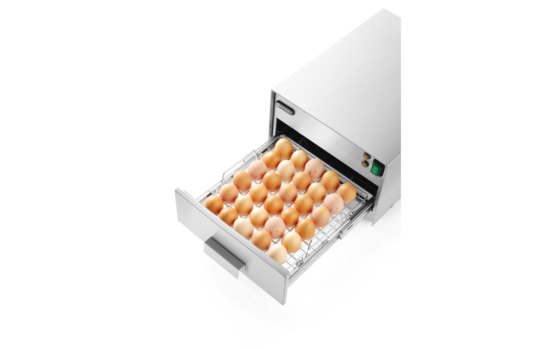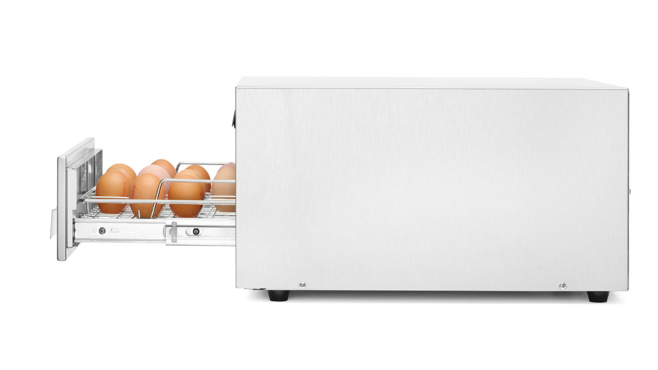 Onmisbaar voor elke keuken. in school, hotel, restaurant, kantine of patisserie. Desinfecteert 30 eieren per keer. Roestvast stalen UV-bestendig rooster bevestigd in lagerlade. Eieren worden gesteriliseerd in een bestralingsproces met golven van 253,7 nm lengte. Bestraling (sterilisatie) duurt ongeveer 2,5 minuten. Eieren kunnen direct na het desinfectieproces worden gebruikt. Lampen worden automatisch uitgeschakeld bij het openen van de lade. Behuizing van roestvast staal. Gelagerd eierrek van roestvast staal. Levensduur UV-straler: 7500 uur. Ook geschikt voor het steriliseren van enkele keukenmessen.