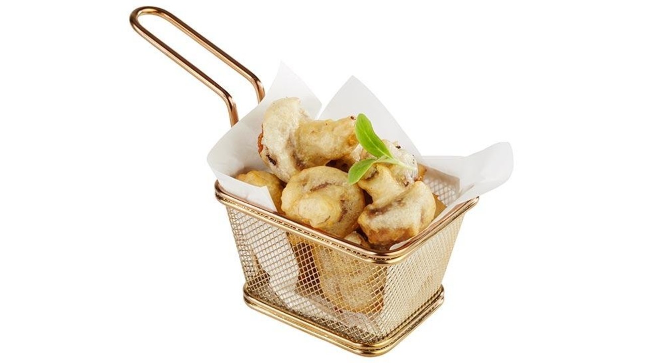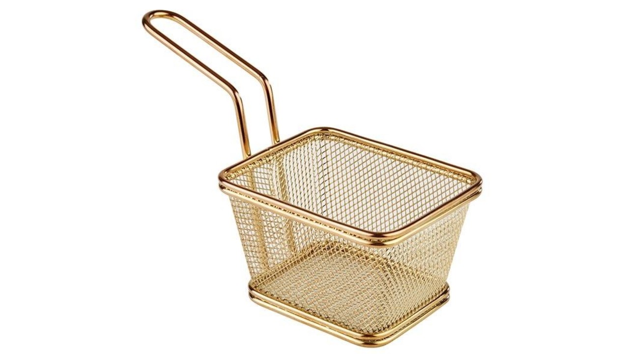 Met dit goudkleurige mandje serveer je originele snacks, tapas en andere individuele gefrituurde gerechtjes.