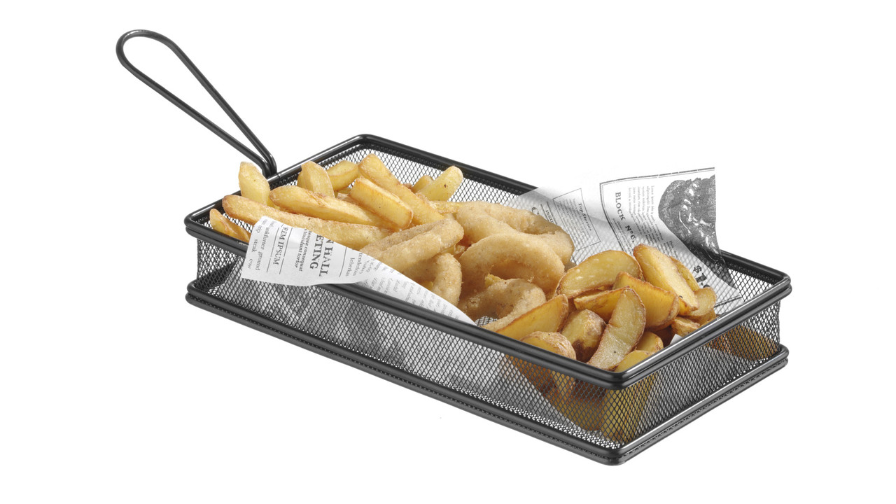 Met dit zwarte mandje serveer je originele snacks, tapas en andere individuele gefrituurde gerechtjes.