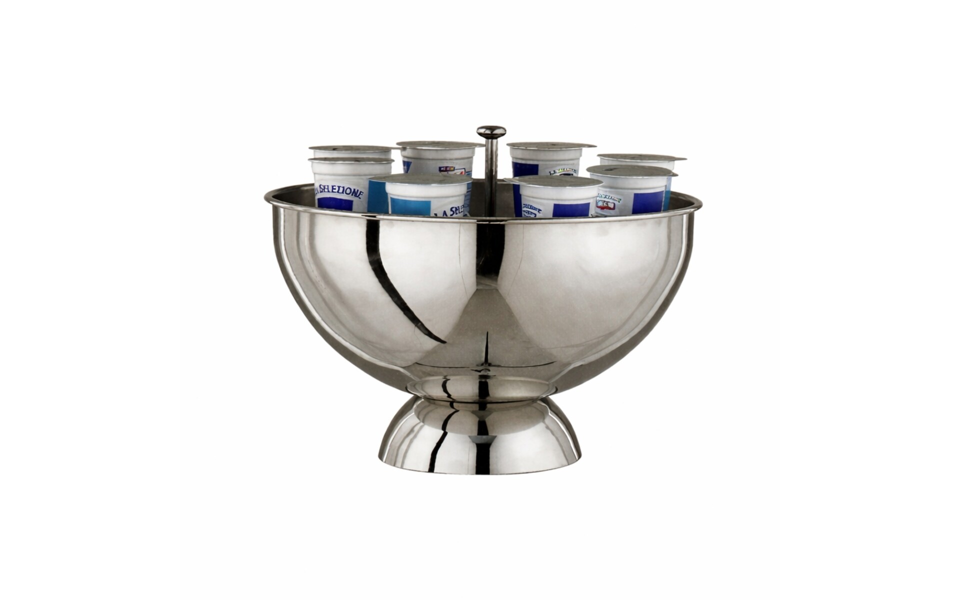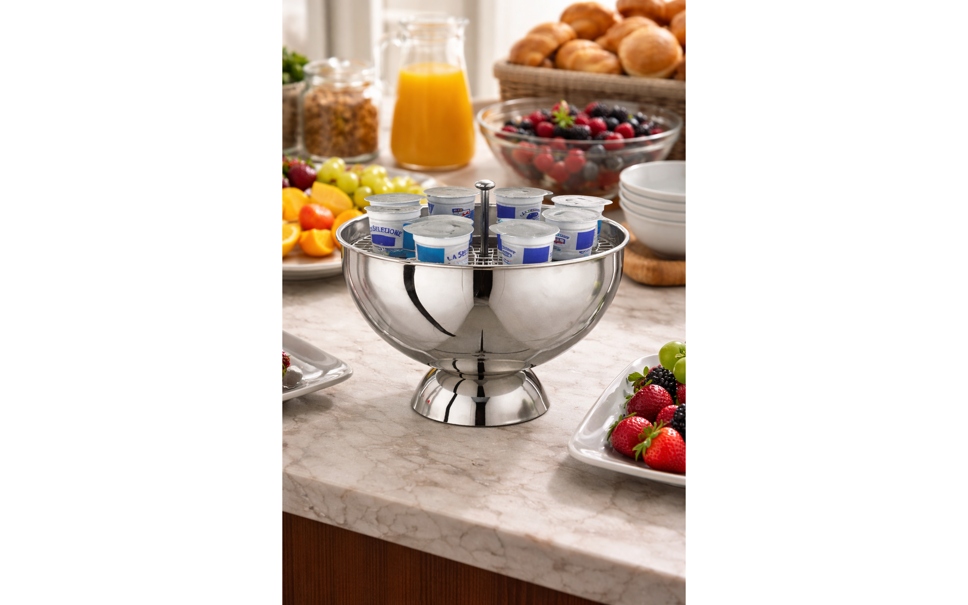 Deze gekoelde yoghurt houder is uitgevoerd in duurzaam roestvrij staal en voorzien van een uitneembaar rooster voor een overzichtelijke en hygiënische presentatie. Ideaal voor buffetten, waarbij yoghurtbekers netjes geordend en goed gekoeld blijven.