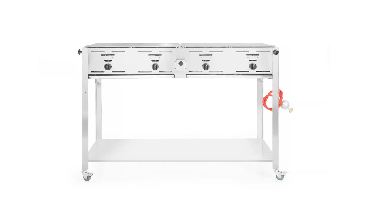 Roestvaststalen frame met 2 vetopvanglades. Geschikt voor butaan- en propaangas, met 4 onafhankelijk regelbare branders. Geleverd met 2 vernikkelde roosters en 1 geëmailleerde bakplaat (590×480×55 mm).