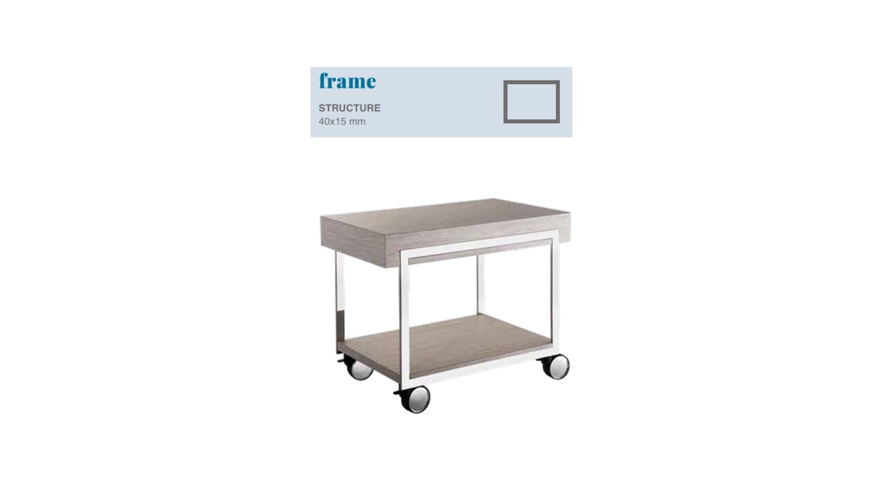 De Guéridon trolley is voorzien van een kruisframeconstructie in AISI 304 roestvrij staal met spiegelafwerking, wat zorgt voor stevigheid, duurzaamheid en een verfijnde uitstraling. De trolley is uitgerust met vier zwenkwielen voor een vlotte en gecontroleerde verplaatsing.