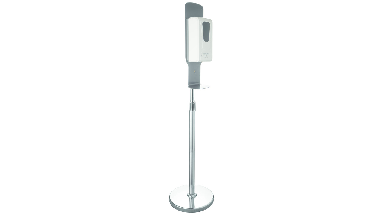 Inhoud van de witte kunststof dispenser is 1 liter en is makkelijk navulbaar. De stevige roestvrijstalen staander is in de hoogte verstelbaar.van 90 tot 150 cm. Het desinfectiestation werkt op 4 x AA batterijen die meegeleverd worden.