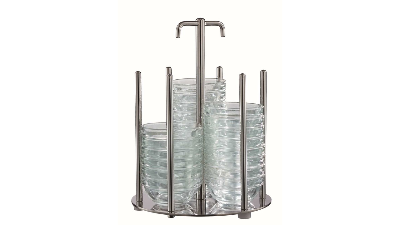 Houder voor maximum 48 stuks stapelbare glazen kommetjes. In de opgegeven prijs zijn 48 kommetjes inbegrepen. Afmetingen Ø stand 14,5 cm h 23,5 cm