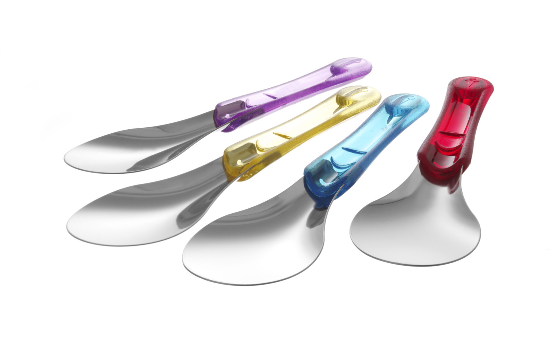Deze set omvat een blauwe, rode , gele en paarse spatel. Lengte 260 mm. Vaatwasmachine bestendig . Roestvrijstaal met Tritan handvat.