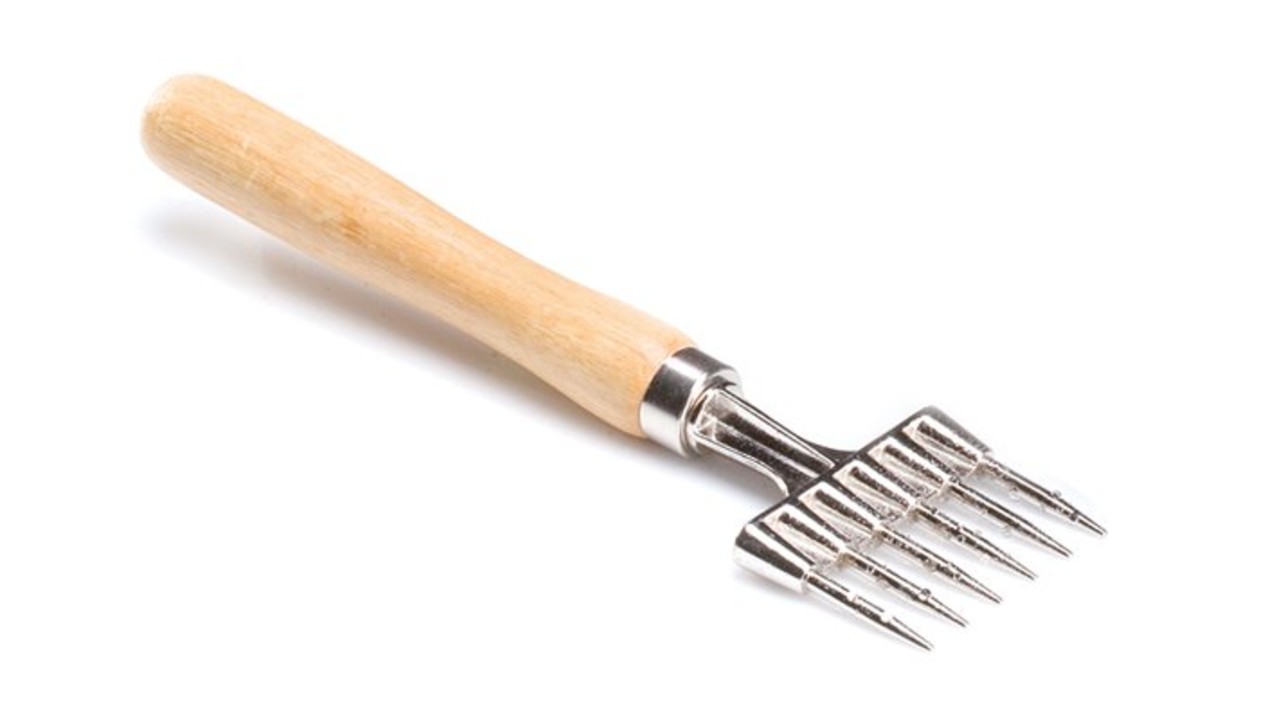 6,5 x 2 x L 23 cm. Gelakt houten handvat. Met zes vertinde tanden.