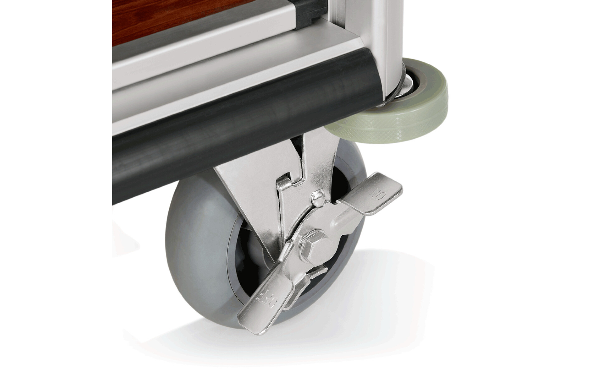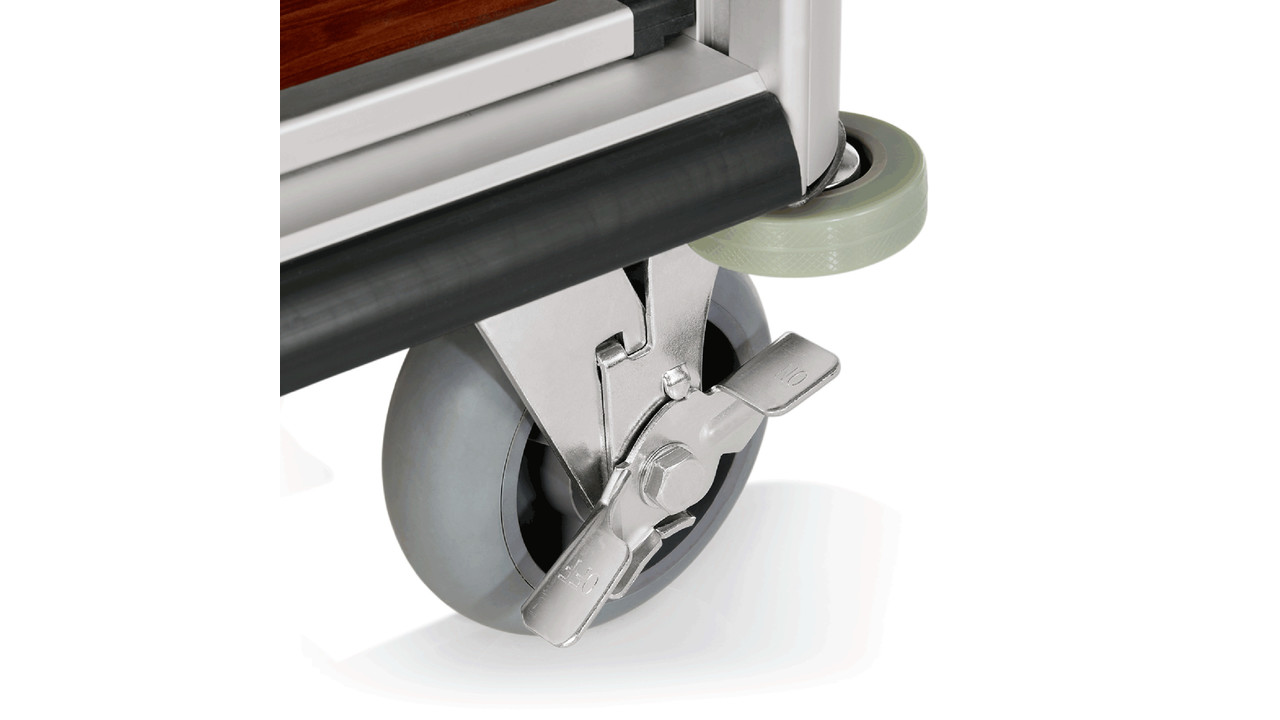 2 zwenkwielen Ø 15 cm, met rem en 2 bokwielen.