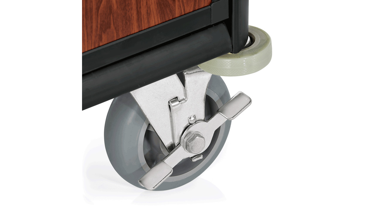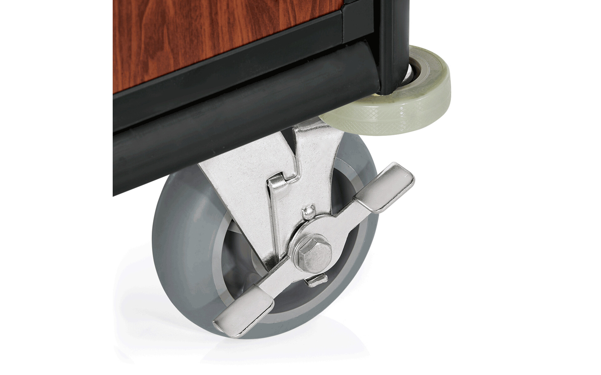 2 zwenkwielen Ø 15 cm, met rem en 2 bokwielen.