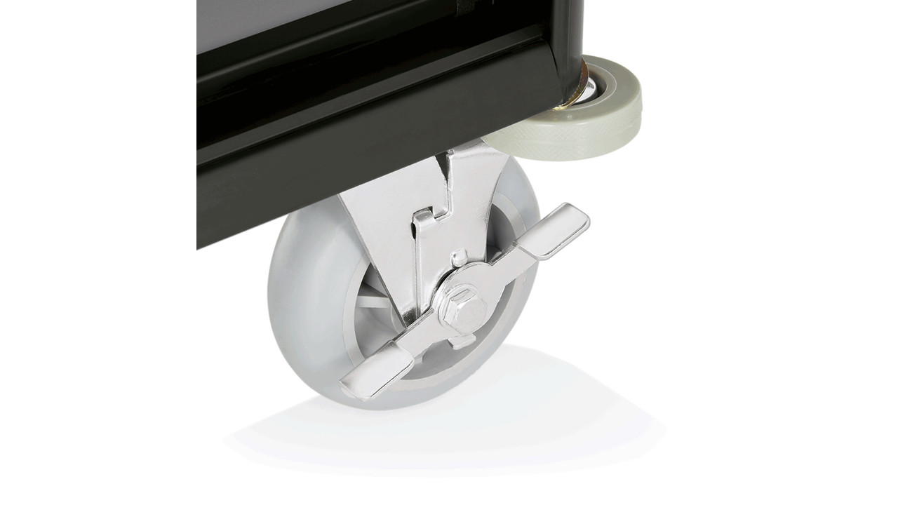 2 zwenkwielen Ø 15 cm, met rem en 2 bokwielen.