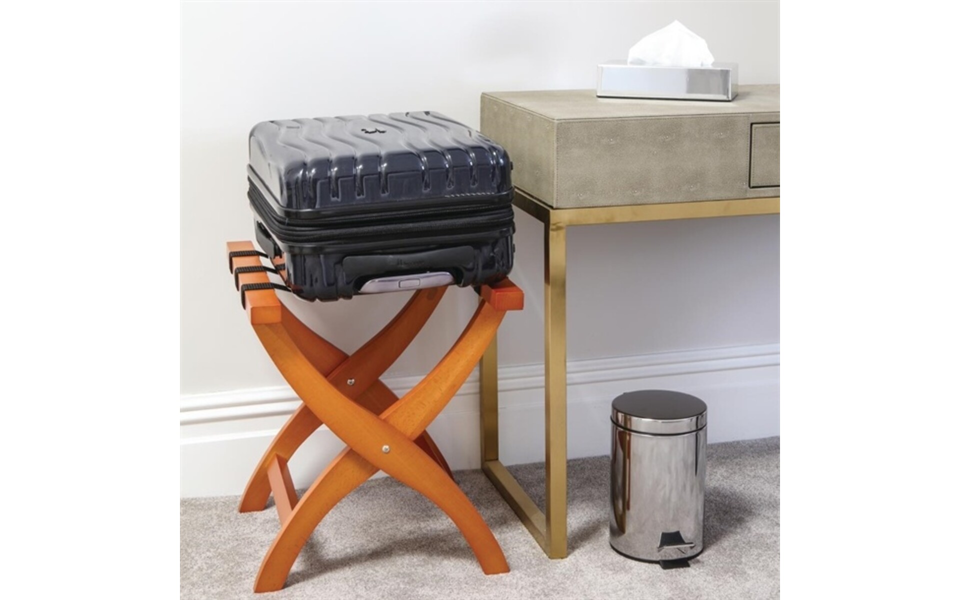 Deze kofferstandaard heeft een honingkleurige afwerking en elegante gekruiste gebogen poten en