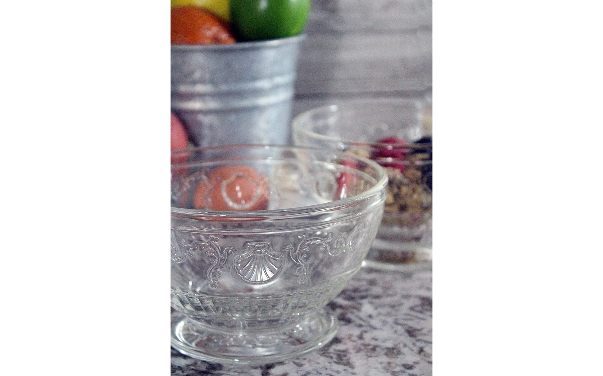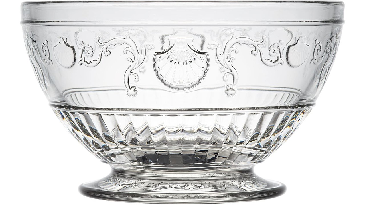 Deze coupe is gemaakt van geperst glas. Voorzien van barokke patronen in reliëf, voluten, bloemen en sint-jakobsschelpen.