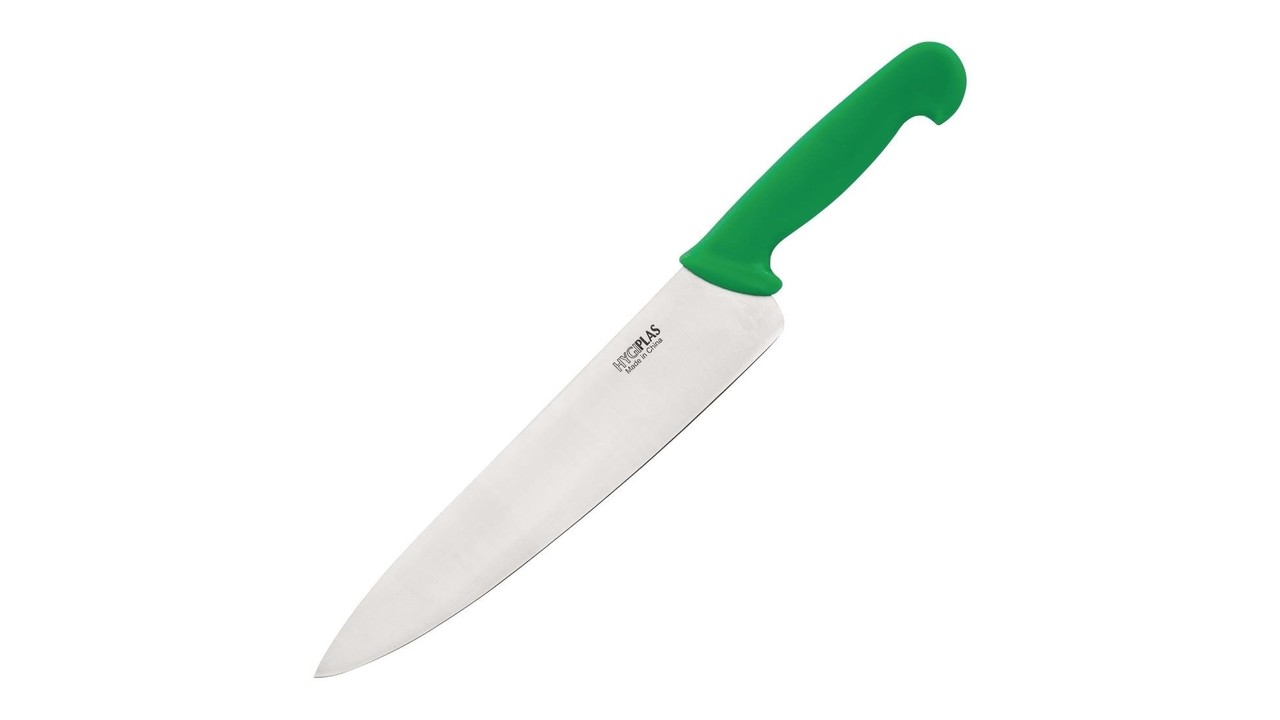 Het groene heft laat zien dat het mes bedoeld is voor het snijden van rauwe groenten. Correct gebruik van het mes helpt het risico op kruisbesmetting te verkleinen en zorgt dat uw keuken zo hygiënisch mogelijk blijft.