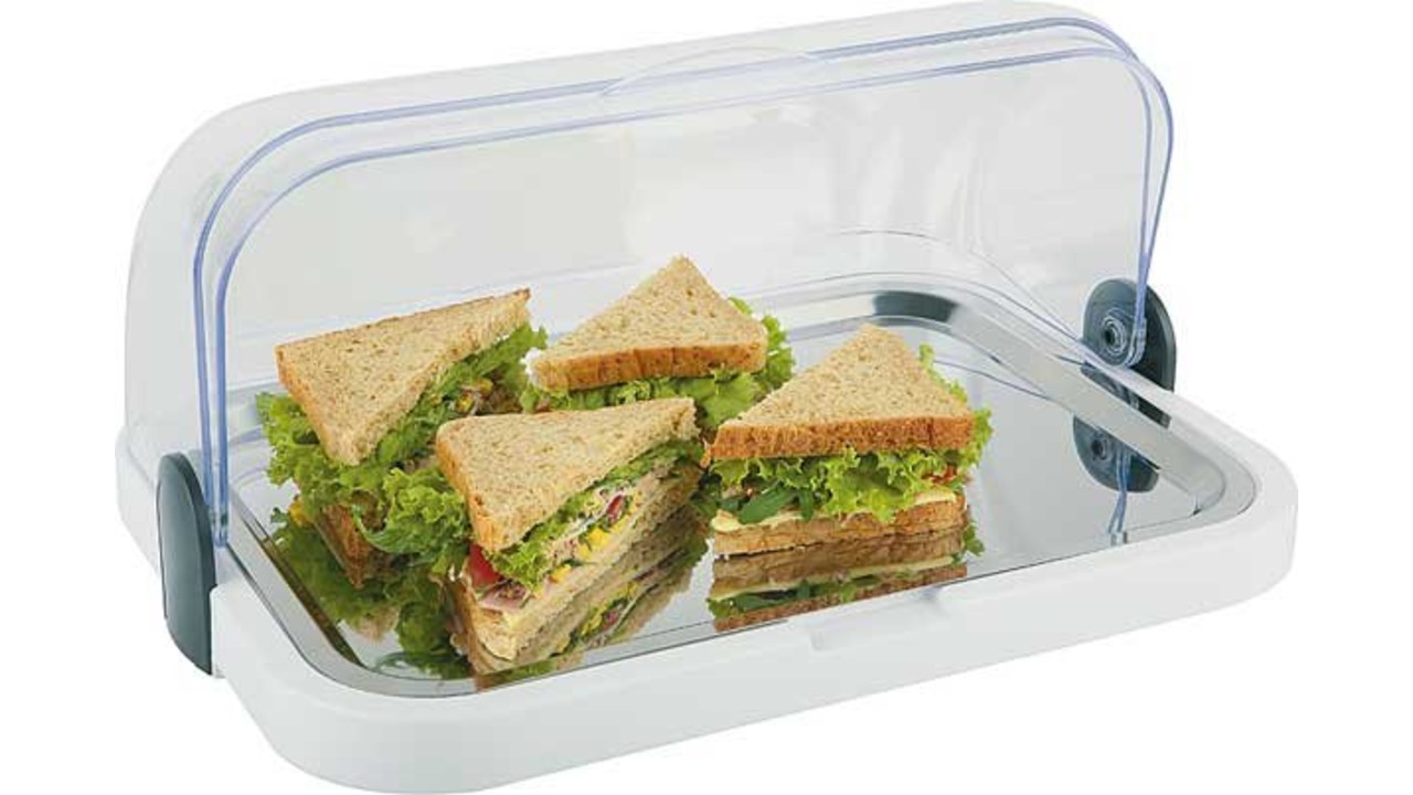 Deze set omvat 1 witte basis met 2 koelelementen, 1 roestvrijstaal dienblad met afm. 39 x28 cm en 1 roll top klok