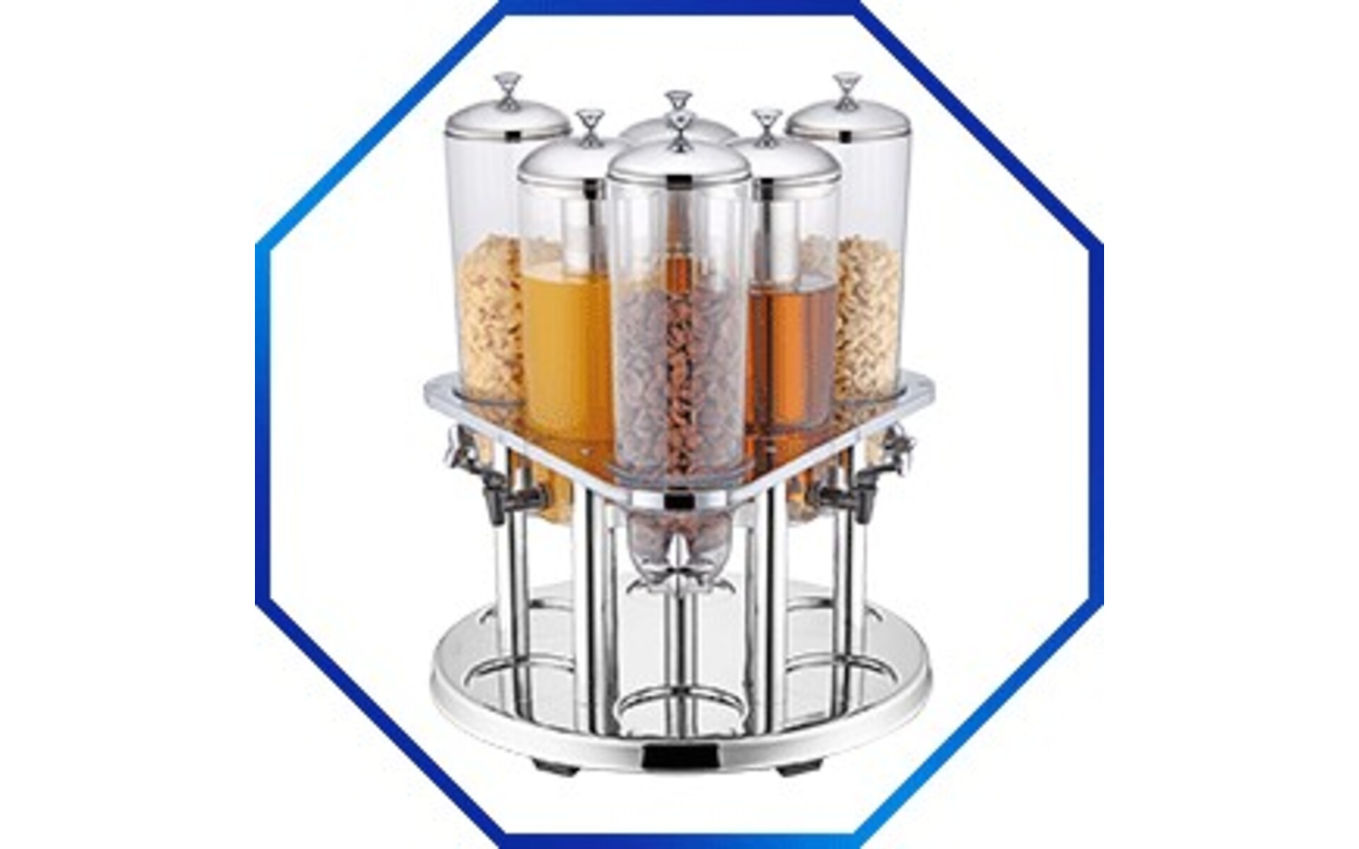 3 x drank (3 liter) en 3 x muesli/cornflakes met transparante containers, hoogglans roestvrijstaal frame, de koeling van de drankdispensers geschiedt d.m.v. een roestvrijstalen koker welke gevuld kan worden met crushed ice of ijsblokjes
