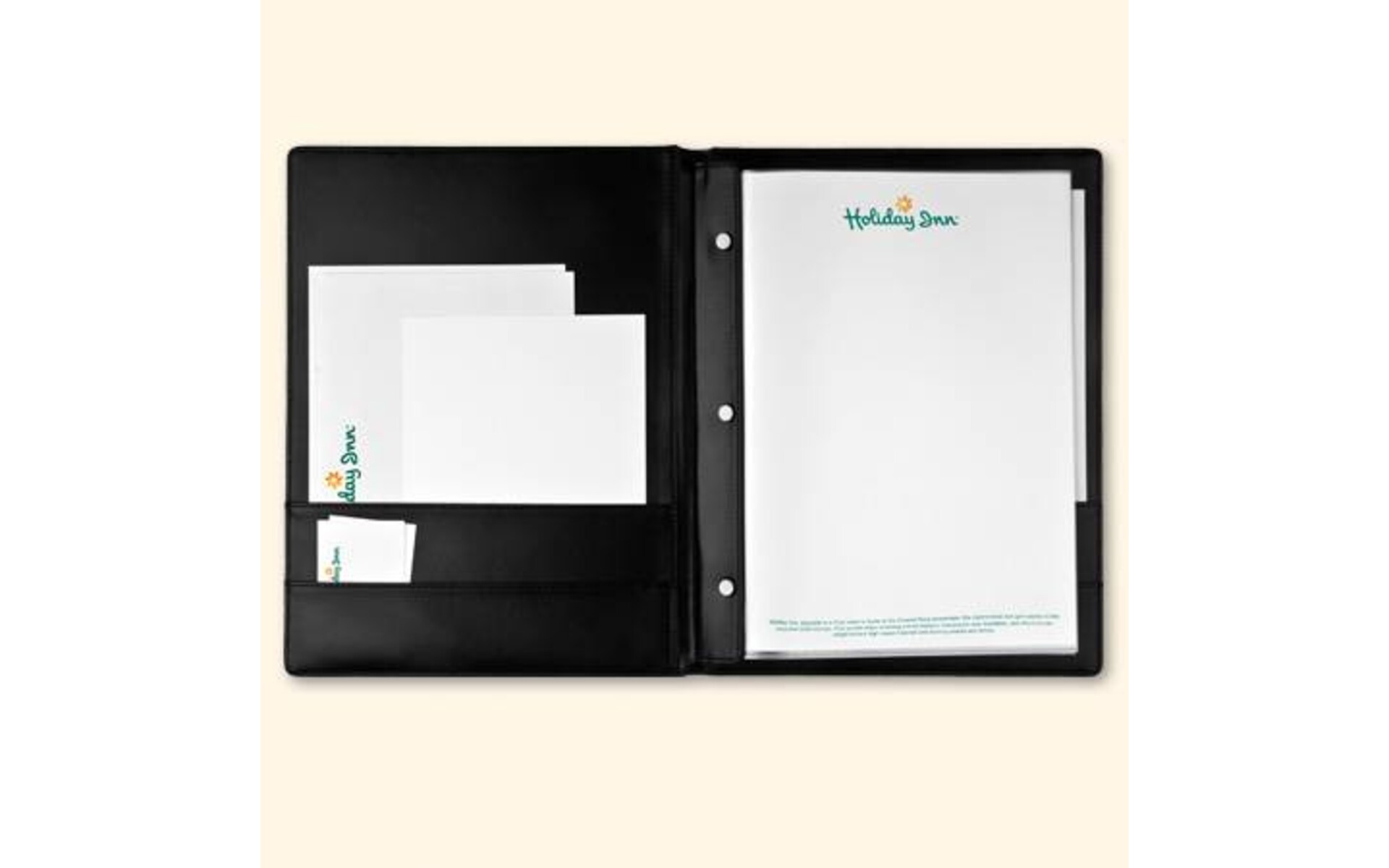 Luxe hotelinformatiemap voorzien van 4 insteekvakken en een boekschroefsysteem. Uitgevoerd in een luxe glad simili-leder. De mappen zijn gewatteerd uitgevoerd. Model din A4 Bedrukking is mogelijk tegen meerprijs.