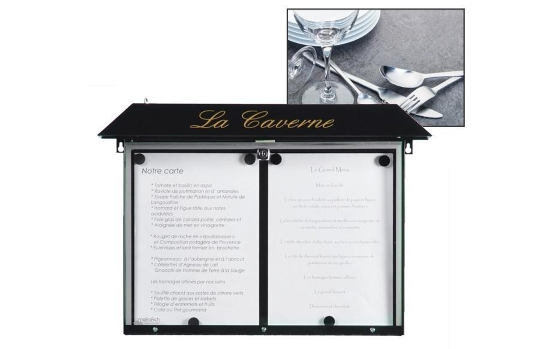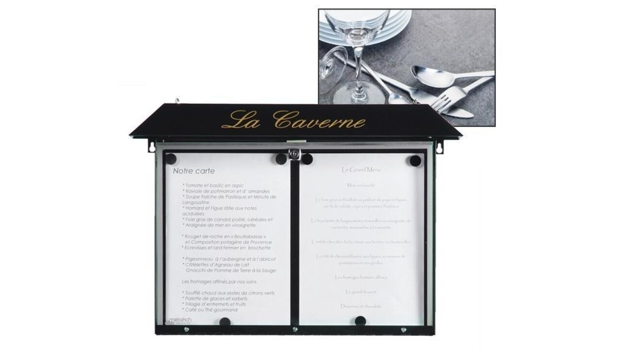 VERLICHTE MENUHOUDER VOOR DE BUITENMUUR. Zorg ervoor dat u uw etablissement wilt ontdekken en betreden door deze aan de muur gemonteerde menuhouder voor buitengebruik te adopteren. Naast het onder de aandacht brengen van een menu, kunt u met deze effectieve marketingtool de visuele identiteit van een restaurant belichamen, een goed imago overbrengen en ontdek creatieve recepten.