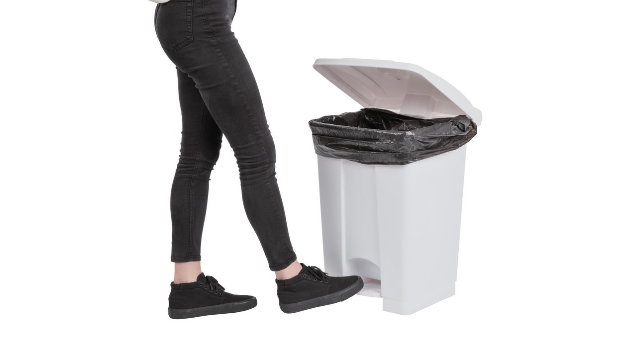 Stevige polypropylene afvalbakken met hygiënische pedaal bediening. Voorzien van haken voor bevestigen van vuilniszakken en luchtdichte deksel ter voorkoming van geuren.