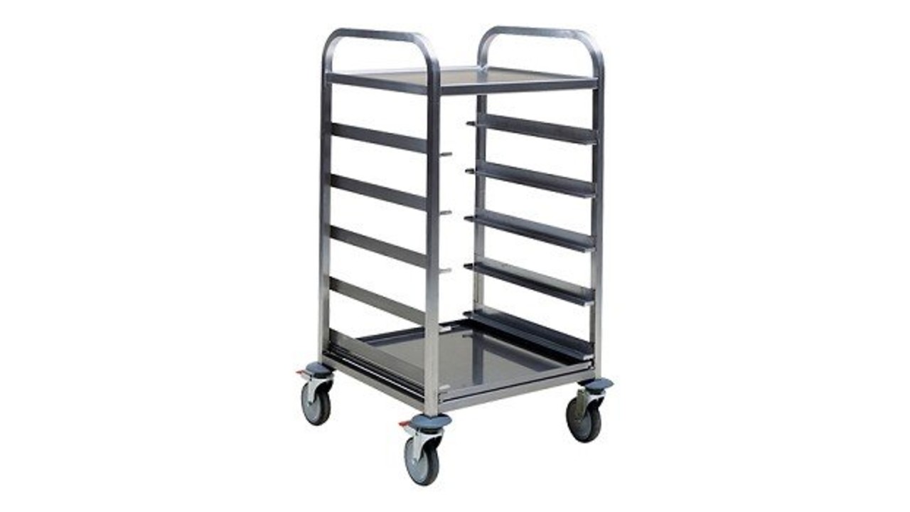 Extra zware roestvrijstalen uitvoering met 5 etages Geschikt voor vaatwaskorven van 50x50 cm. Dit laag model is voorzien van roestvrijstalen werk/afzetplateau. De regaalafstand is 150 mm