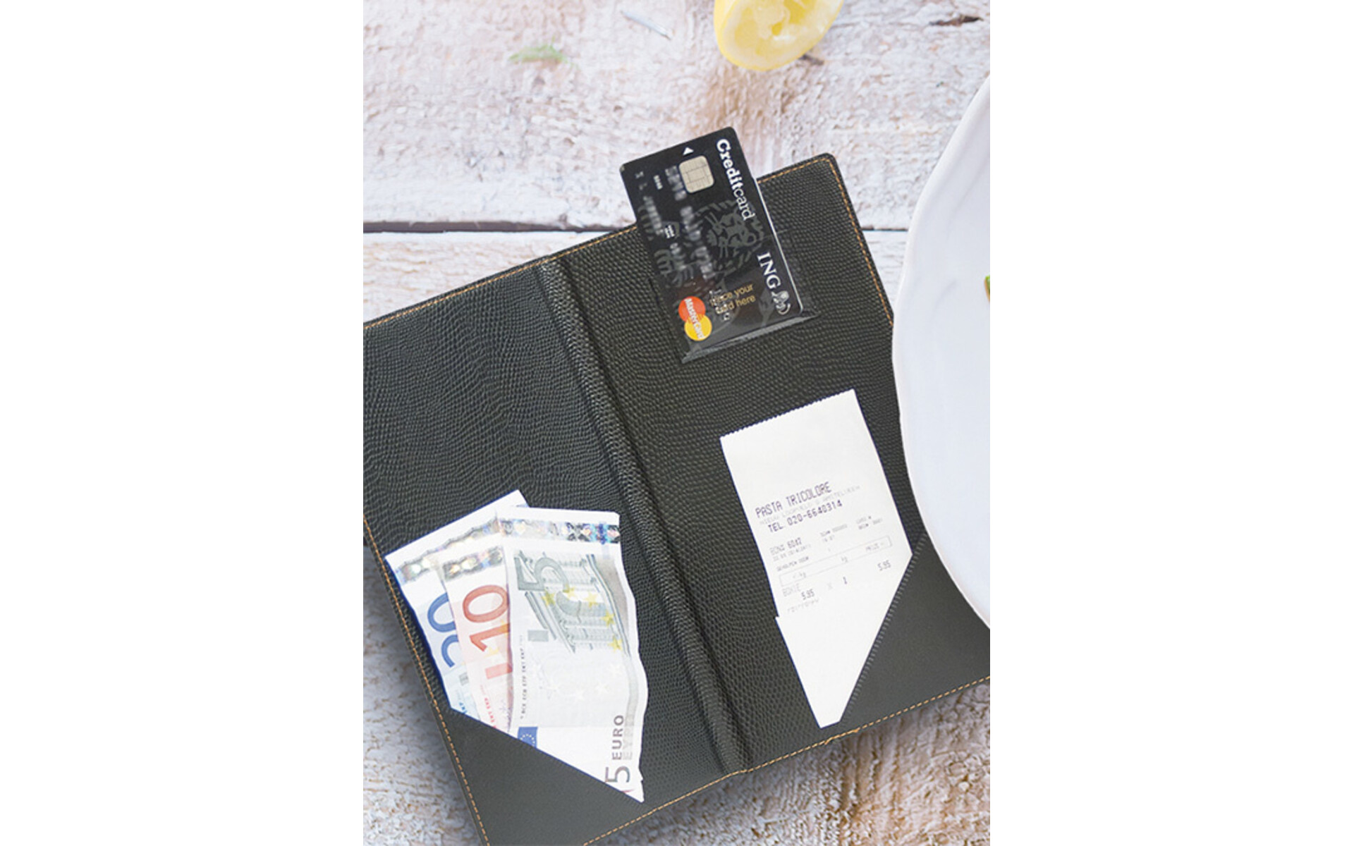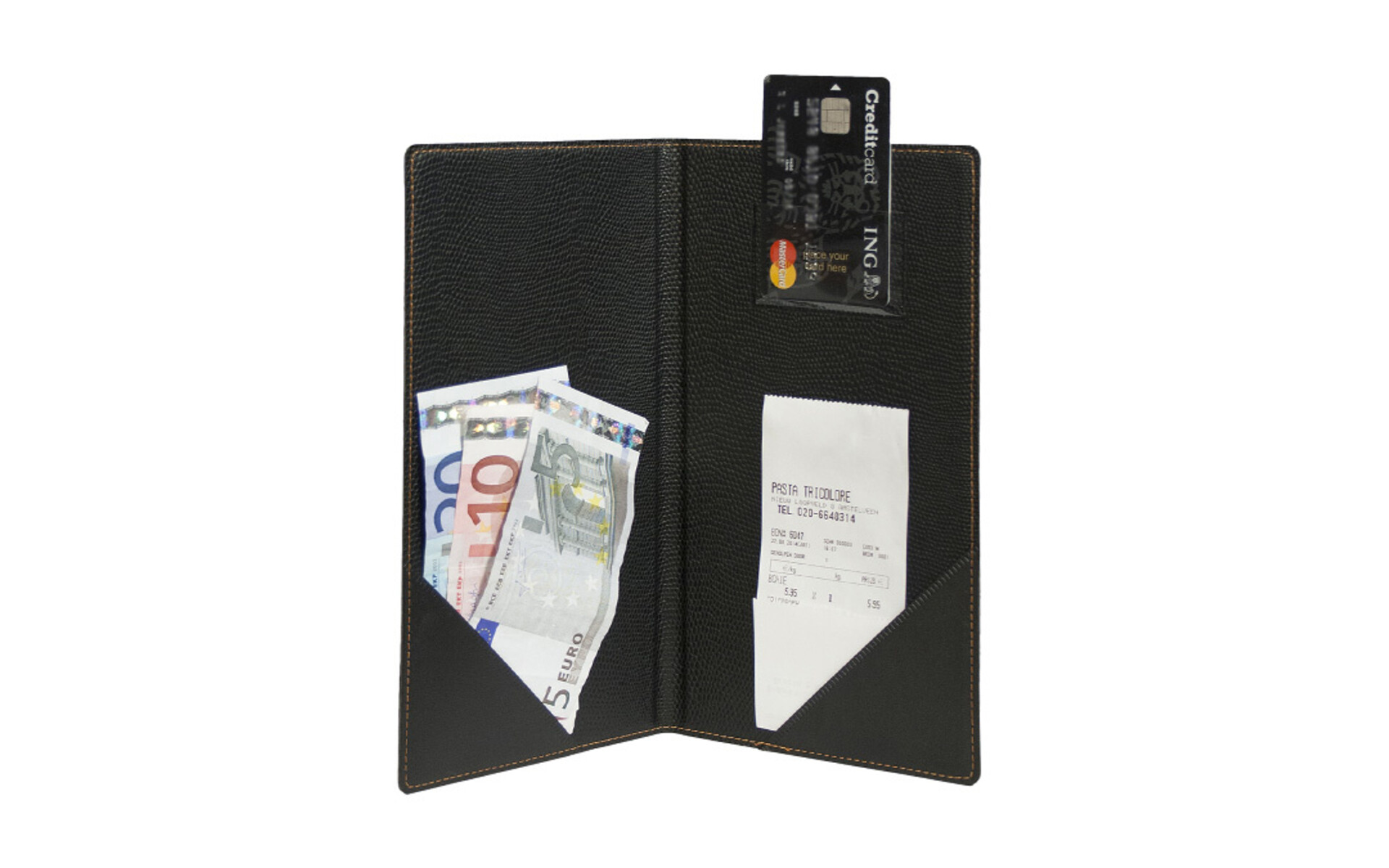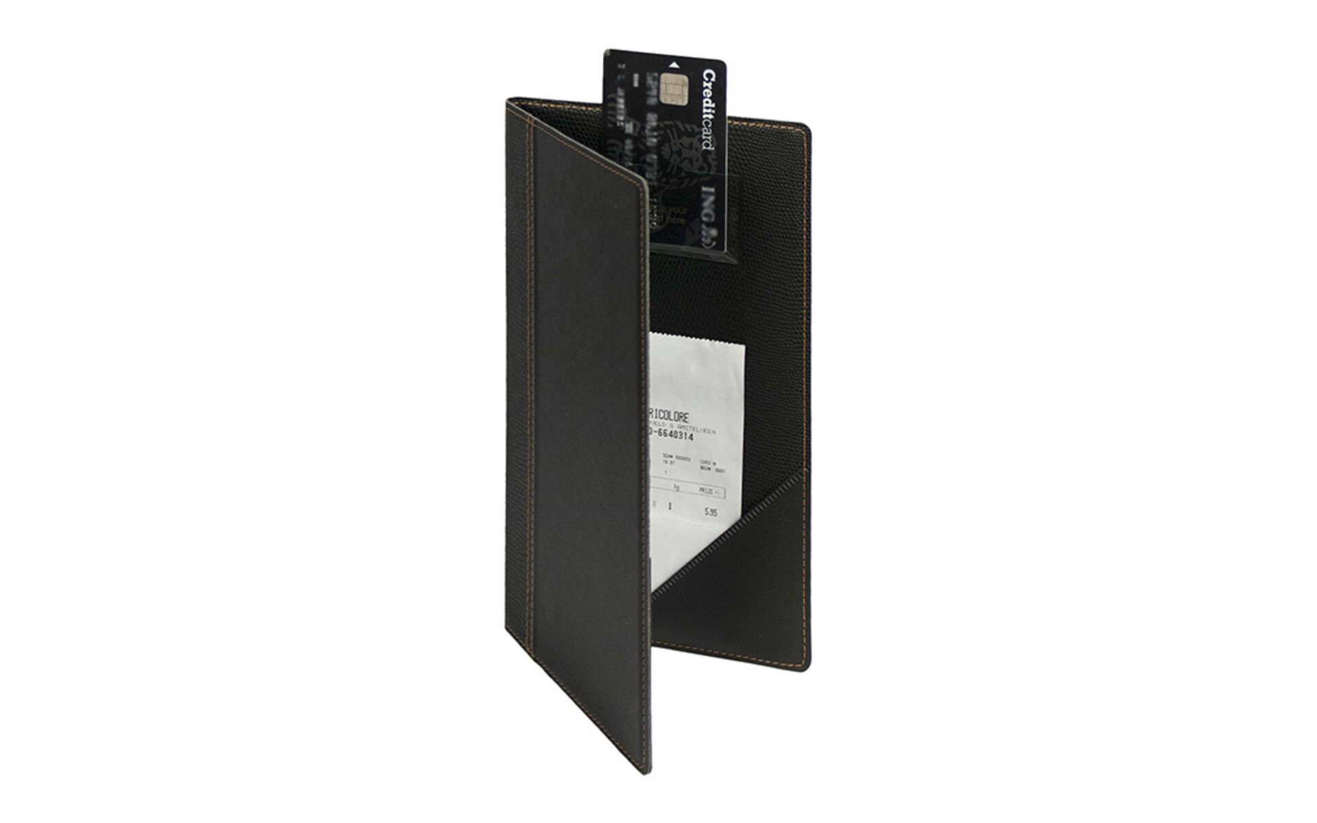 Het vakje aan de binnenkant van de map is handig om de rekening of creditcard in te steken. Het zwarte imitatieleer heeft een klassieke uitstraling ideaal voor bar of restaurant. De rekeningmap is voorzien van een mooi contraststiksel en is geschikt voor professioneel gebruik.