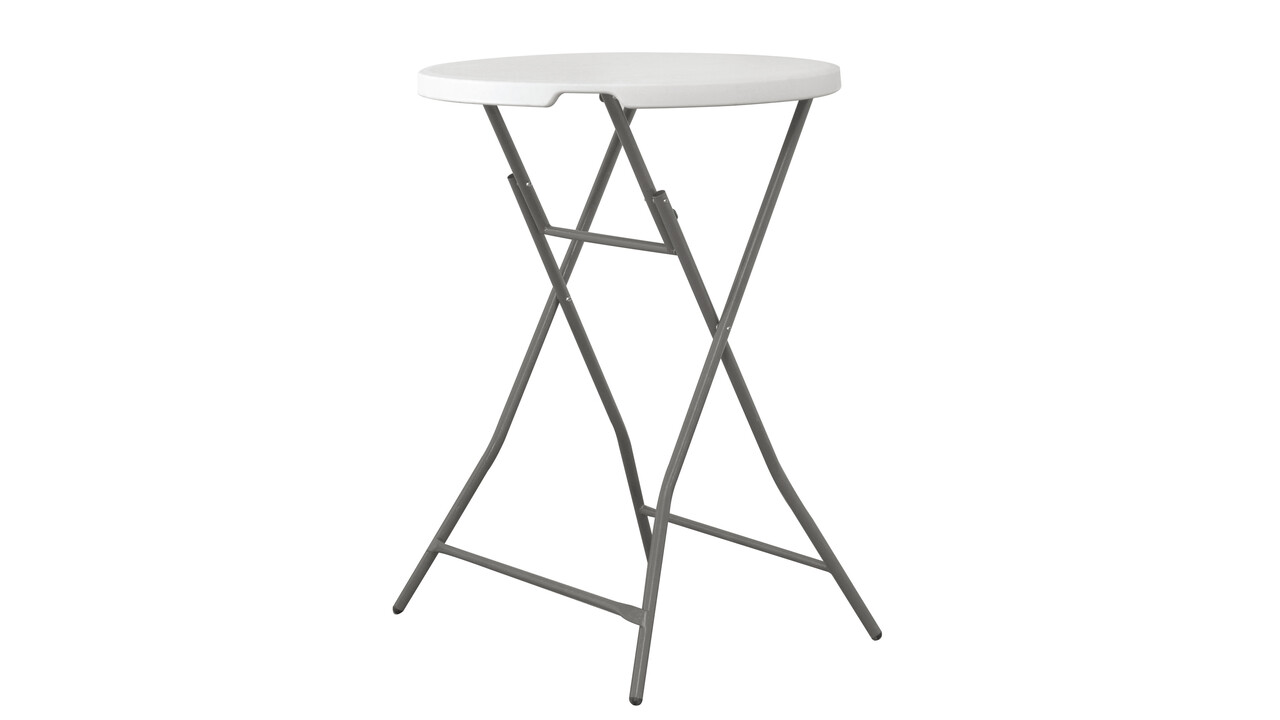 Gemakkelijk te vervoeren en op te bergen inklapbare meubels voor binnen en buiten gebruik. Ideaal voor beurzen, evenementen, catering, verhuur. Tafelblad van HDPE polyethyleen, frame gemaakt van gepoedercoat metaal. Gemakkelijk te reinigen en vuilweren
