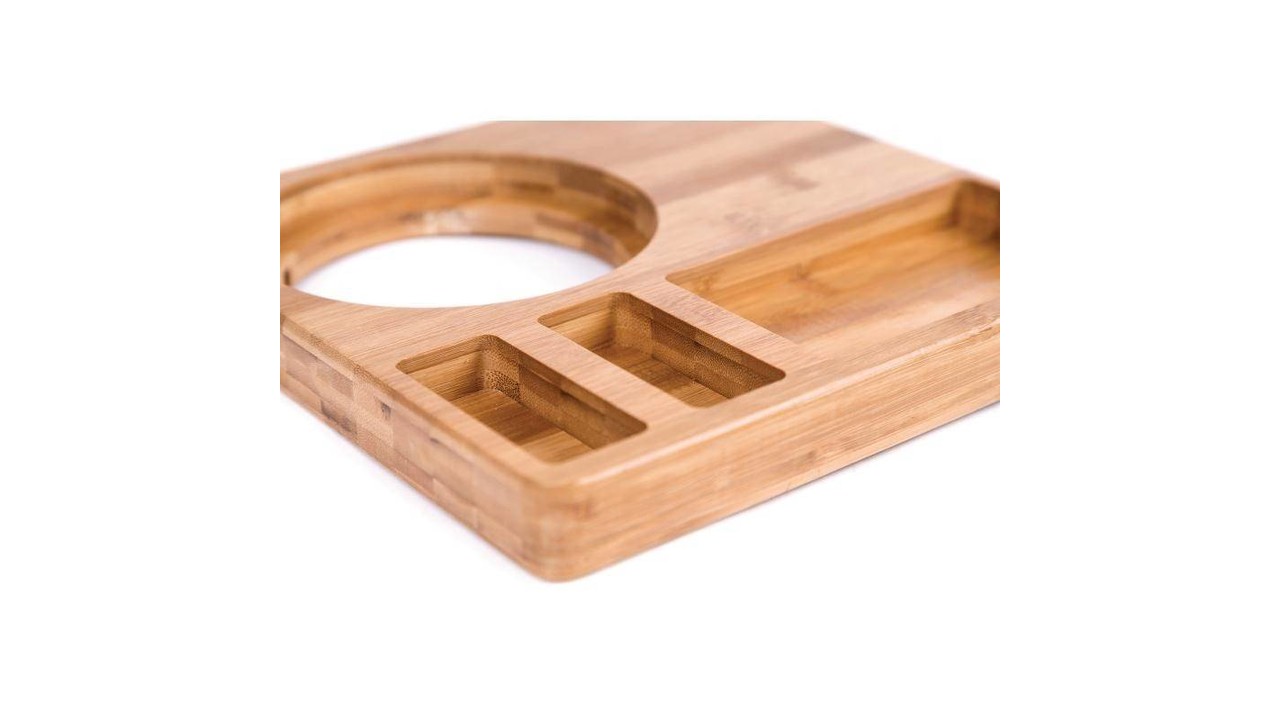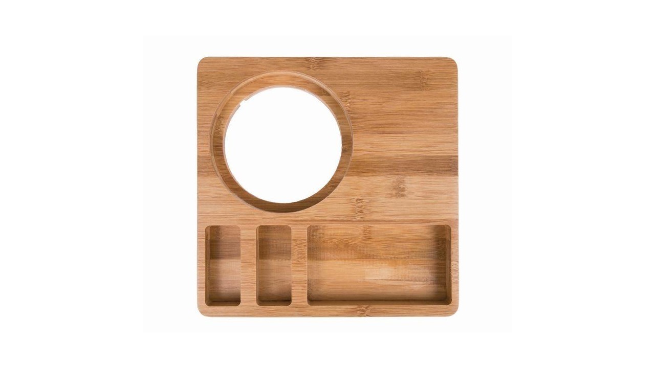 Eenvoudig te reinigen, afgeronde randen Voedselveilig bamboe, afm. 30(H) x 260(L) x 260(B)mm Inzet voor waterkoker (14(Ø)cm) en een uitsparing voor het snoer 2 kleine inzetten: 8(b) x 3,5(l)cm en 1 grote inzet: 8(b) x 14,2(l)cm