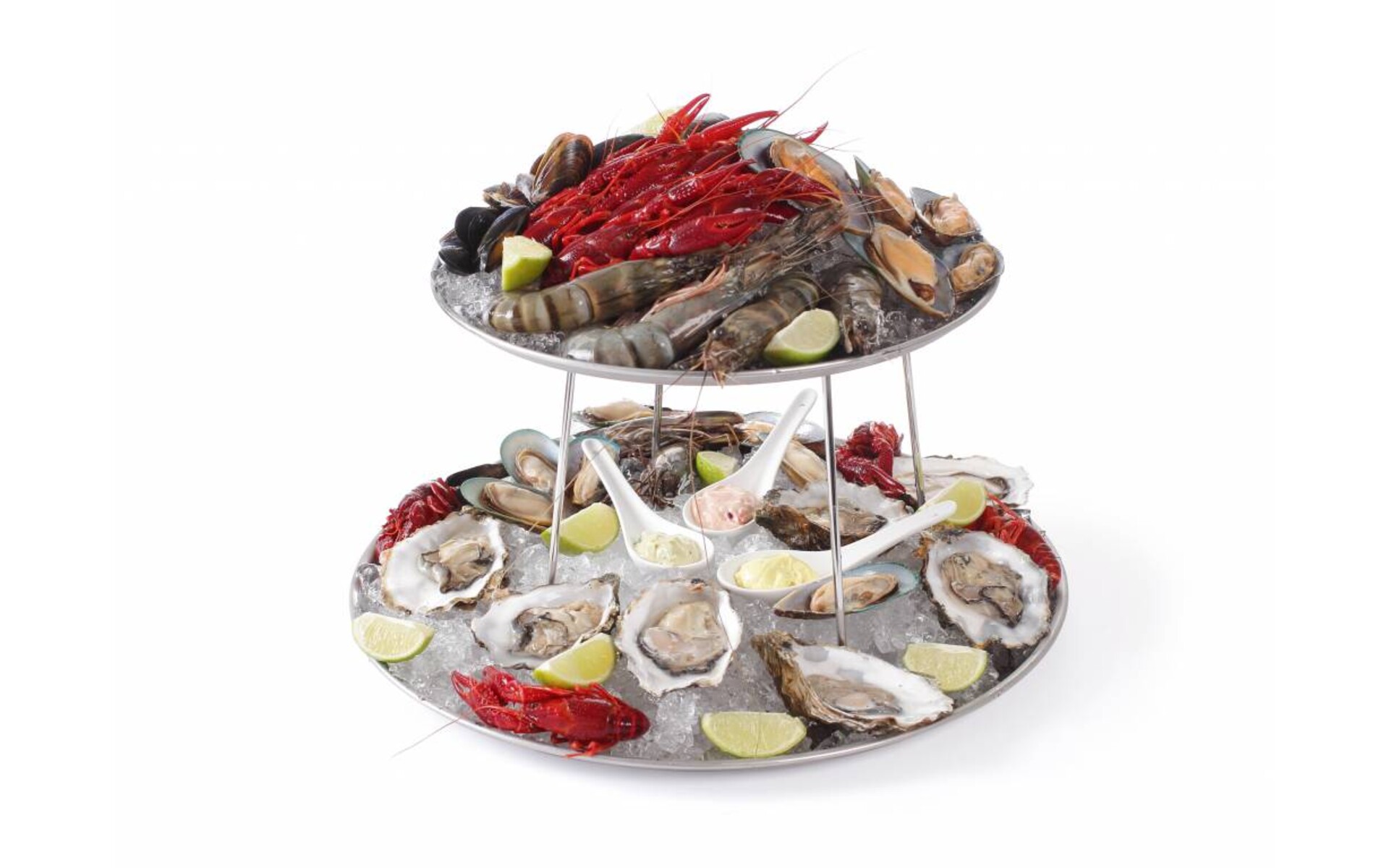 Deze 3 delige set omvat 2 zeevruchten schotels 30cm en 40cm diameter en één standaard met een hoogte van 20 cm
