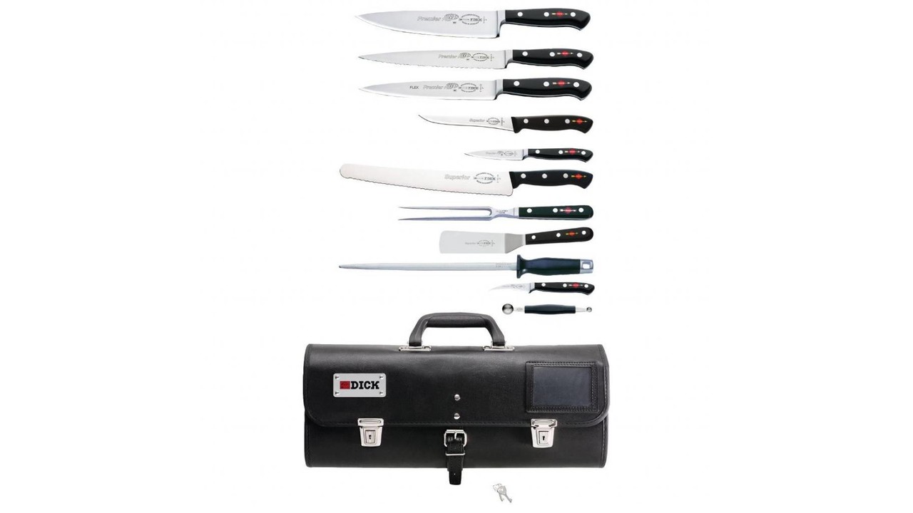 Premier Plus: 22cm vleesmes, 8cm schilmesje, 18cm fileermes, 9cm schilmesje, 22cm koksmes Superior: 13cm spatel, 15cm uitbeenmes, 25cm broodmes Parisienneboor, 18cm vleesvork, 25cm aanzetstaal In een duurzame en veilig afsluitbare foudraal Zeer scherp