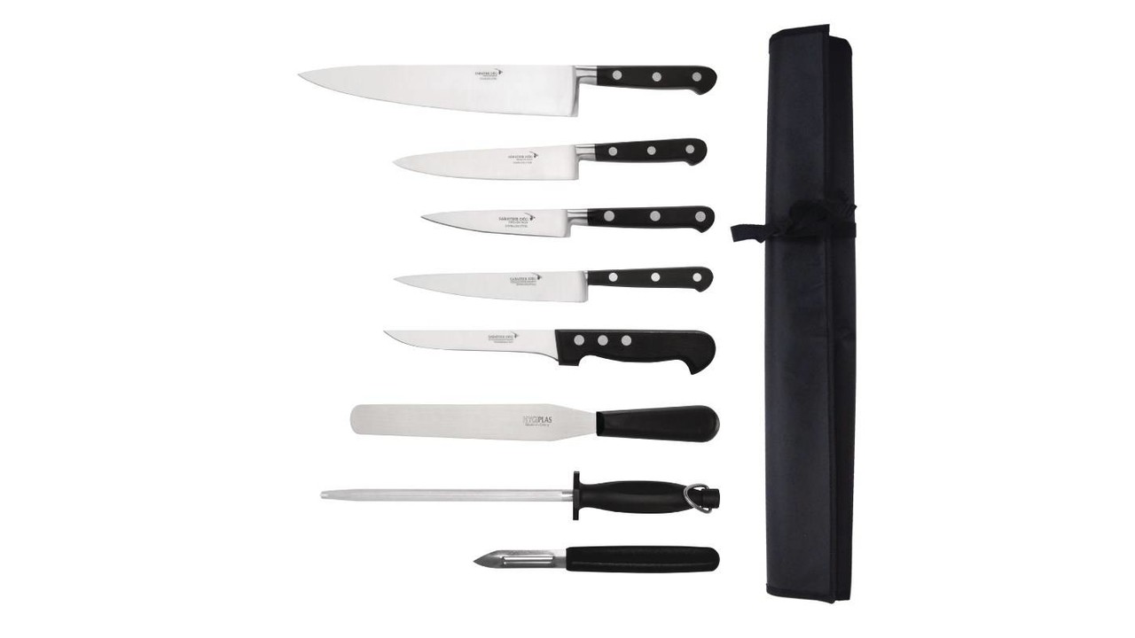 Top kwaliteit messenset van Déglon Sabatier met thermoplastische handgrepen en RVS lemmet. De set bevat het volgende: 25,5cm koksmes, 15cm koksmes, 10cm koksmes, 15cm fileermes, 15cm uitbeenmes, 20,5cm paletmes, 25,5cm wetstaal en dunschiller