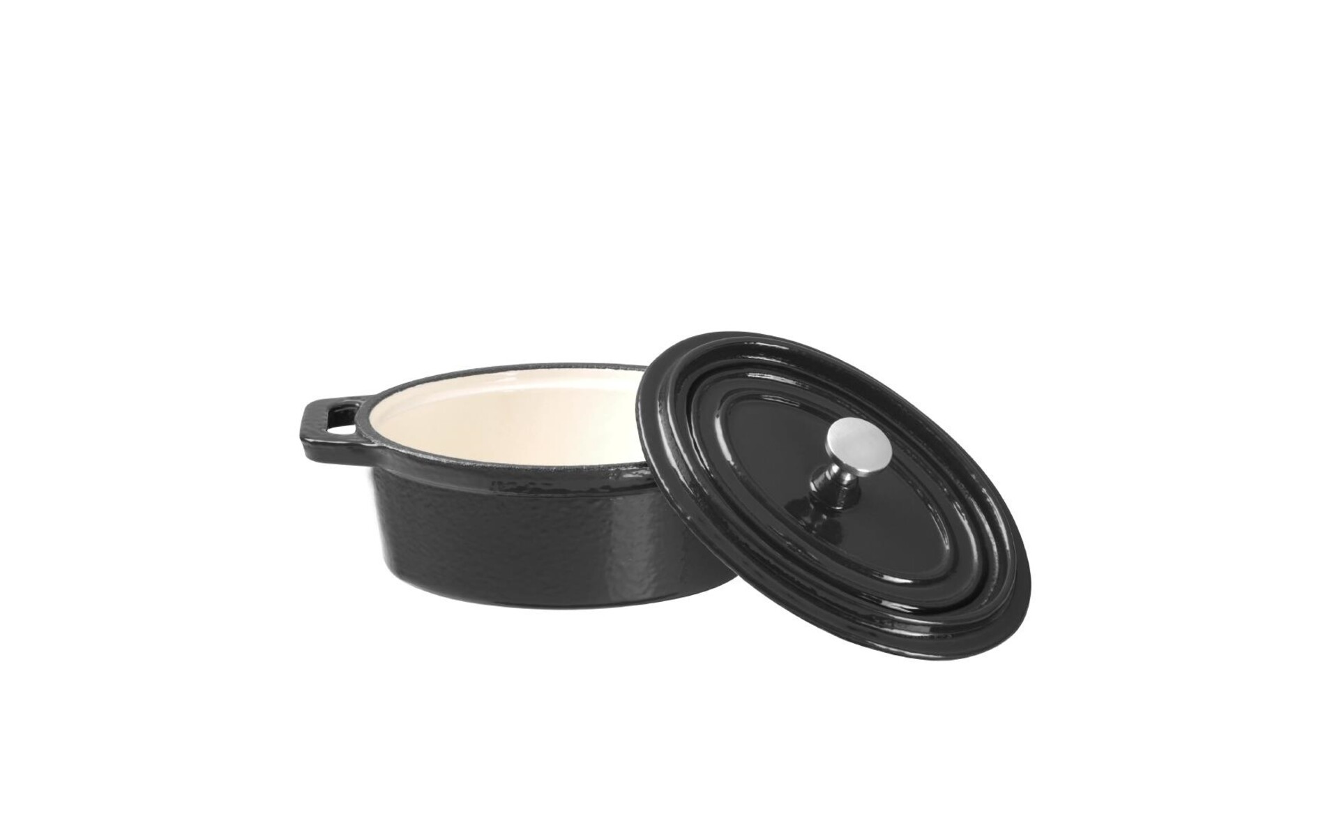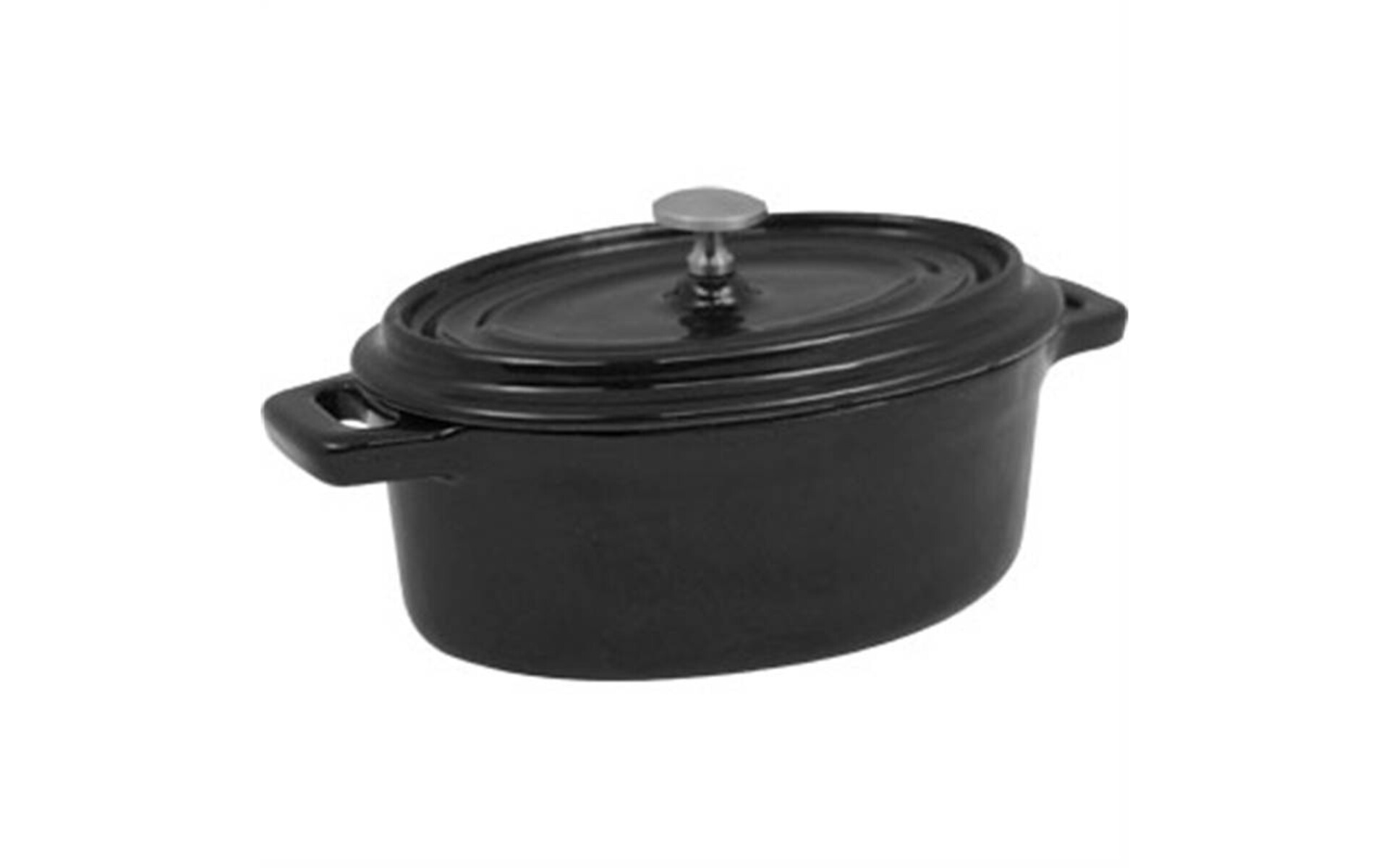 Zwarte gietijzeren mini braadpan. Ovaal, binnenmaat 45(h)x84(b)x113(d)mm.