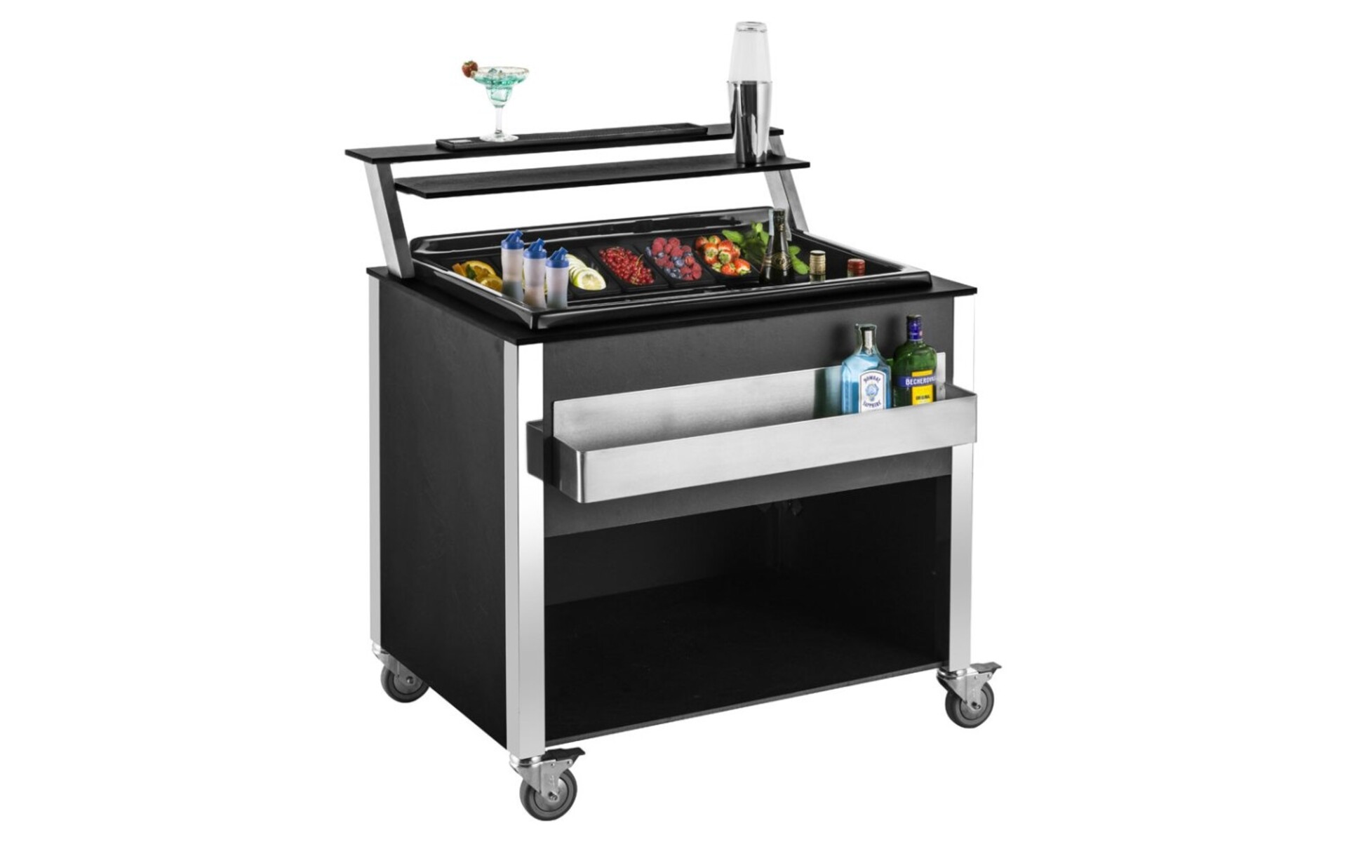 Afmetingen bovenste serveerplanken : Plank 1 : 93 x 13,5 x 1,5 cm. Plank 2: 85 x 20 x 1,5 cm. Maximale lading per plank 10 kg. Inclusief speedrack van roestvrij staal, maximale lading 50 kg. Deze wagen is gekoeld door middel van ijsblokjes en voorzien van een aftapkraan.