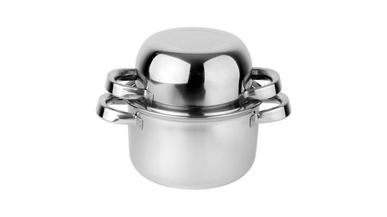 RVS mosselpan, een moderne variant op het klassiek zwarte model. Serveer de gekookte mosselen direct van het fornuis op tafel. Het deksel kan worden gebruikt als schaal voor de schelpen.